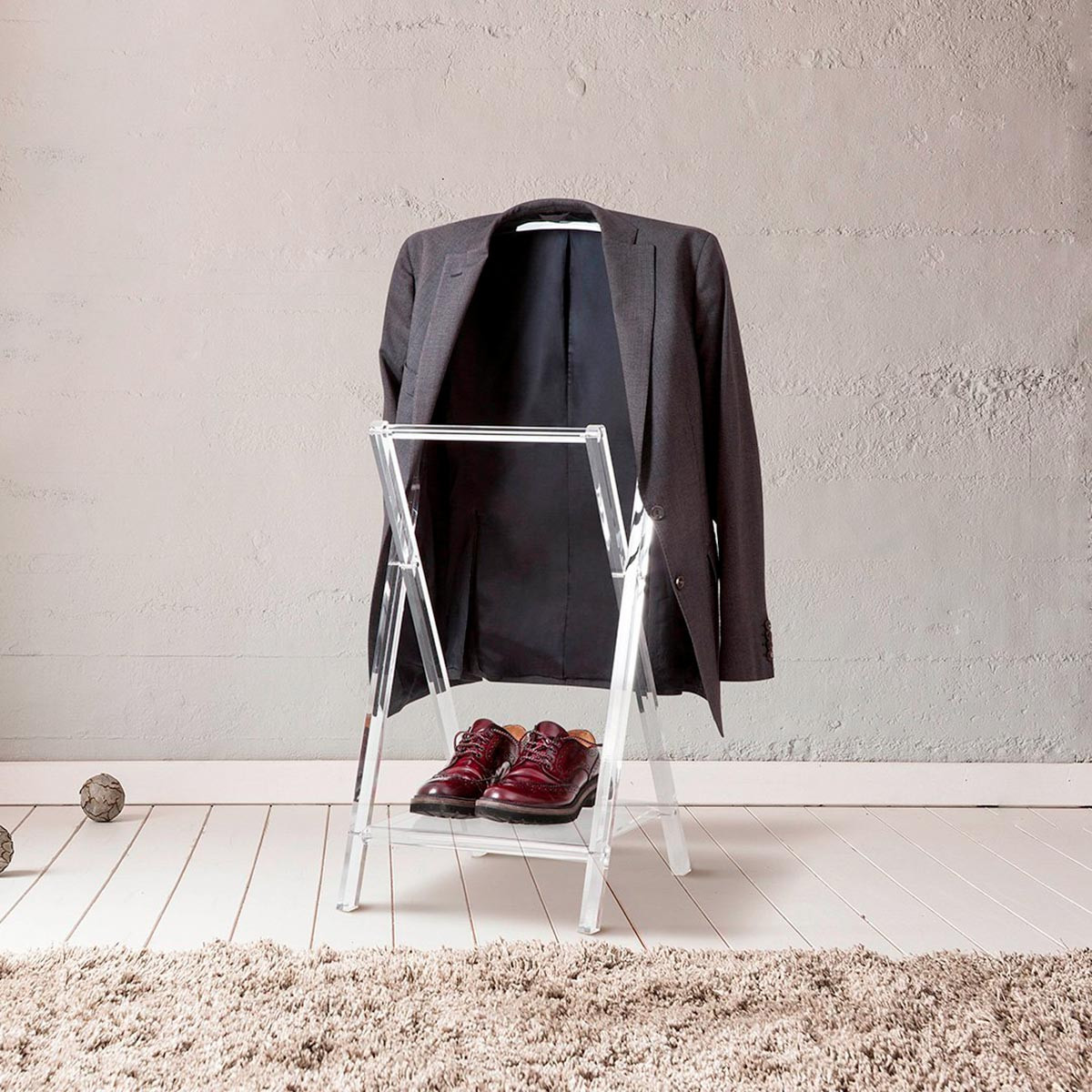 Il Servomuto ICS trasparente Vesta Home è un appendiabiti di design in cristallo acrilico trasparente pieghevole con barra porta giacca ed indumenti e vano inferiore porta scarpe.