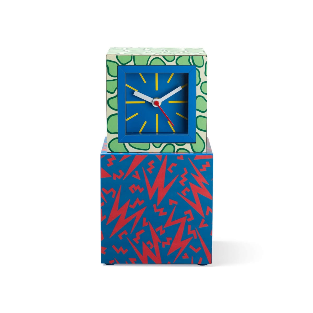 Memphis Milano Acapulco Orologio di George J. Sowden è un orologio di design rivestito in laminato decorativo. Edizione limitata di 30 pezzi. Nell'orologio da tavolo Acapulco, disegnato da George Sowden, la funzionalità e la razionalità si combinano con l’emozione esaltata dalla esuberanza decorativa e cromatica. Acapulco presenta forme solide e geometriche, due cubi impilati; ciò nonostante, il rigore compositivo è rotto dalla dimensione differente dei due solidi sovrapposti adornati da pattern vibranti e a contrasto. L’impiego estremamente creativo del laminato decorativo caratterizza infatti questo oggetto-totem. Il quadrante rosso è rimarcato dalla cornice dello stesso colore; sono sempre in rosso i fulmini del pattern della “scatola” sottostante. Le lancette e l’indicazione delle ore presentano tratti decisi disposti a raggiera, in bold, senza numeri; al centro la sovrapposizione delle tre lancette è enfatizzata da un cerchio azzurro.