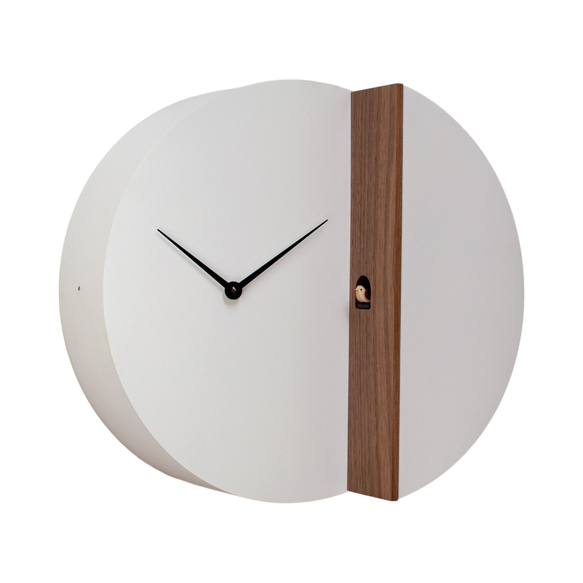 L'Orologio Peek-a-Koo by Progetti è un orologio di design disegnato da Krit Jiratkaruen, cambia la prospettiva del cucù. Infatti, siamo abituati a vedere l'uccellino uscire dal centro dell'orologio, invece, in questo caso, esce lateralmente verso il centro del quadrante. È un orologio dalla forma accattivante grazie ad un insieme di linee morbide che combinate a particolari spigolosi lo rendono una novità. Realizzato con lavorazioni e prodotti unici, viene proposto in due varianti di colore. L'inserto in massello di noce aggiunge un tocco di eleganza. Verniciato con vernici atossiche. Il movimento a cucù, di progettazione tedesca, è di alta qualità ed è alimentato da due batterie, ha un sensore fotosensibile che non lo fa cantare quando è buio. Una pulsantiera permette di regolare l'intensità del suono o di spegnerlo del tutto.