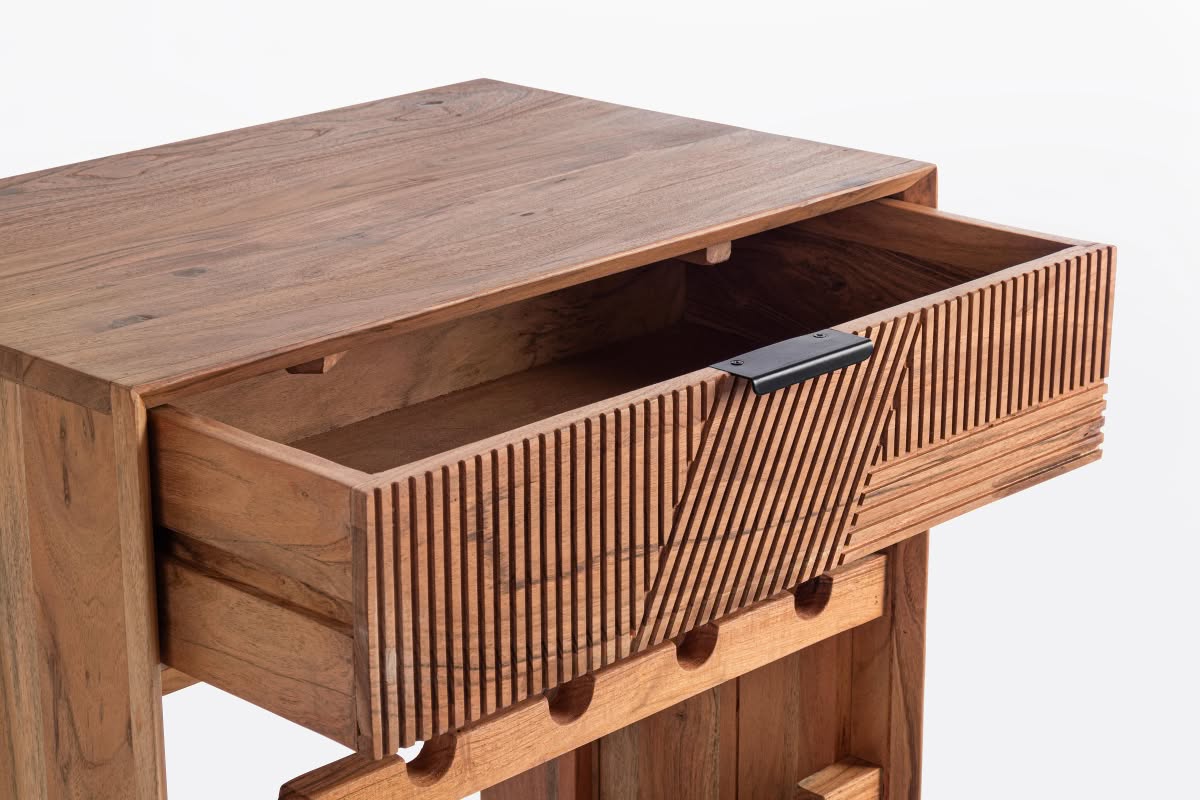 Mobile Bar 1C Isar è un porta bottiglie di design con struttura in legno di acacia, schienali e fondo cassetti in compensato. Frontali cassetti intarsiati e lavorati a mano. Finitura acrilica protettiva. Maniglie e gambe in acciaio. Gambe da assemblare.
