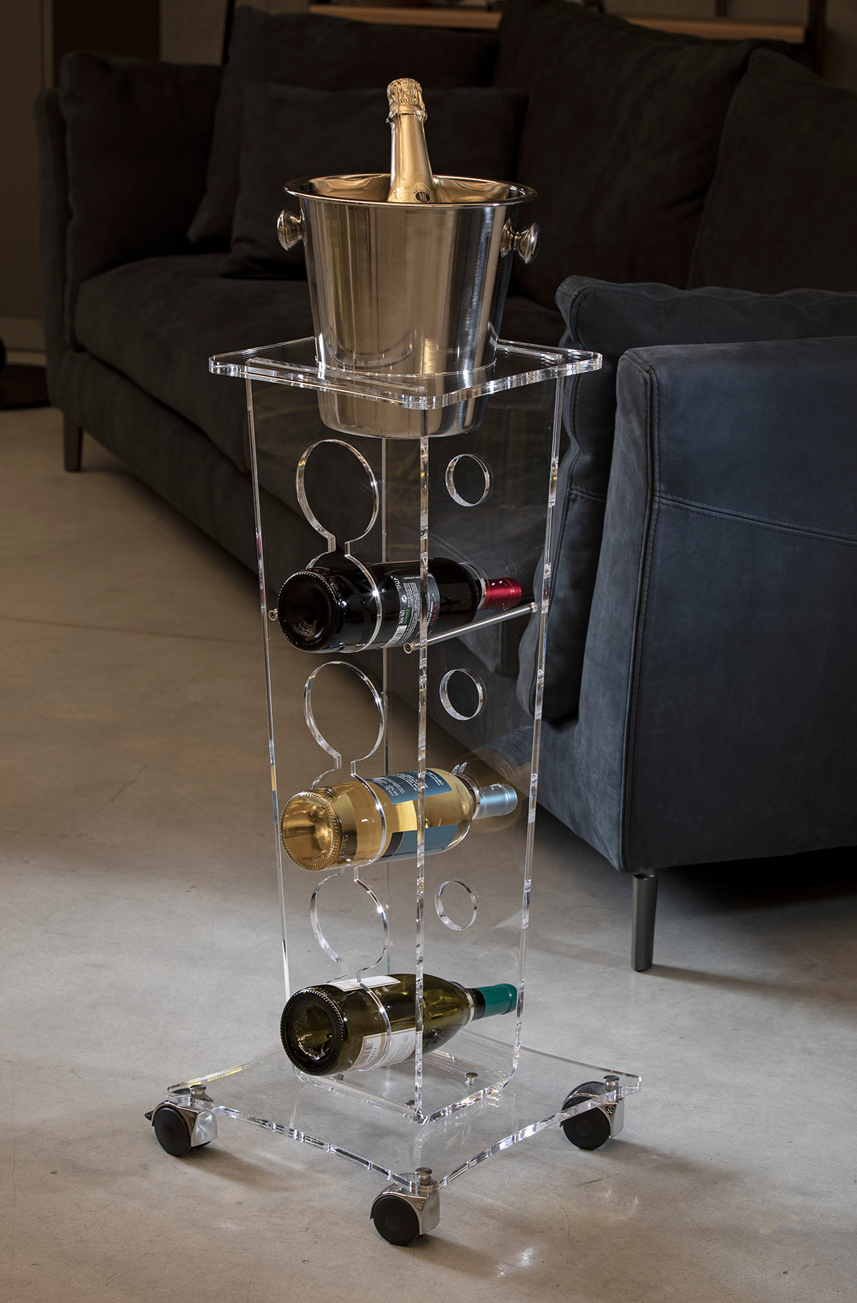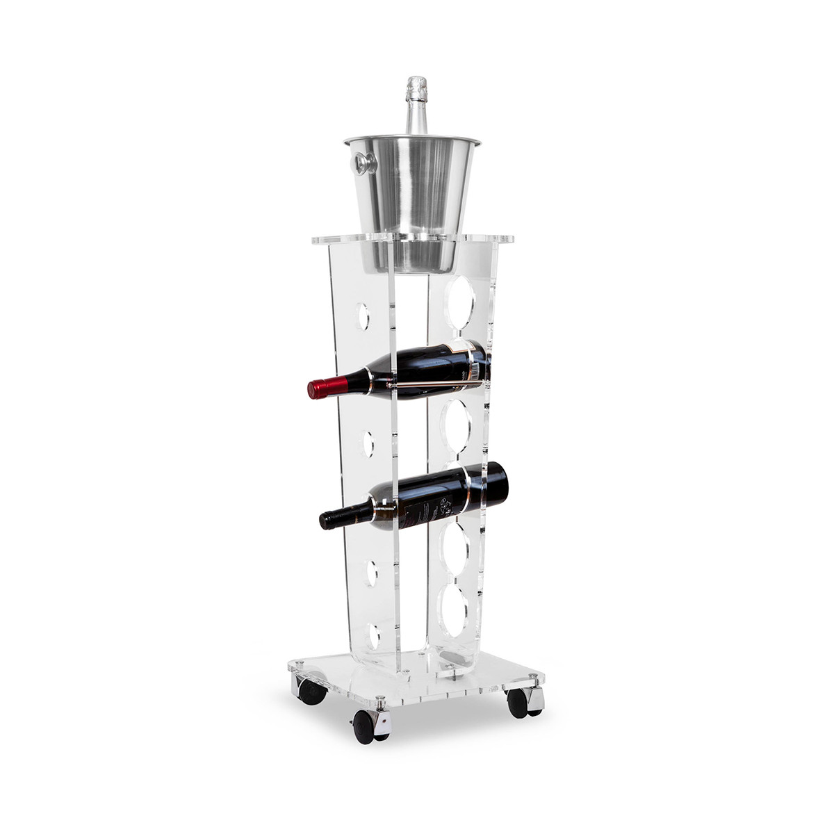 Ice Tower Portabottiglie con rotelle è un portabottiglie di design in cristallo acrilico trasparente e secchiello porta champagne dotato di vani per 6 bottiglie. Dimensioni cm 32x32x95 h. Spessore PMMA mm 10.