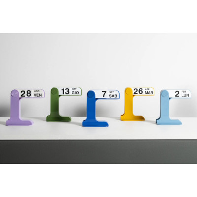 Timor Calendario perpetuo Giallo Matt Special Edititon by Enzo Mary per Danese Milano è un calendario di design proposto nella versione in lingua inglese che grazie alle fascette in pvc apribili a ventaglio, consente di scegliere le palette che identificano mese, numero e giorno della settimana, fissate a un perno. Possiede le caratteristiche di componibilità, flessibilità, lavabilità, trasformabilità garantite dalla plastica.