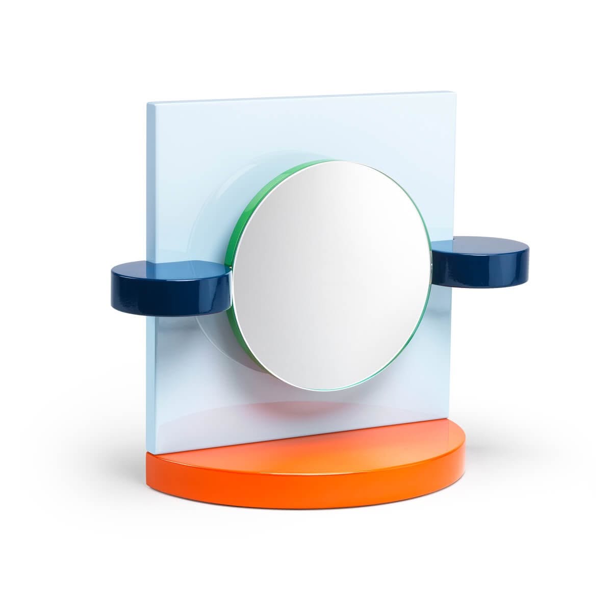 Memphis Milano Dorian Specchio di Michele De Lucchi è un specchio di design da tavolo in legno laccato. Nel 1985, per la rivista "Donna", Michele De Lucchi disegna uno specchio da tavolo come speciale regalo di Natale. Quello specchio sarà d’ispirazione per i progetti Dorian e Ionian, poi inseriti nel catalogo di produzione Memphis. Dorian e Ionian sono due piccoli specchi costruiti in legno verniciato; lo specchio in entrambi è montato su un cardine che fa sì che ruoti secondo il bisogno e il desiderio. Due varianti per uno specchio da tavolo: in Dorian la superficie riflettente è circolare montata su un supporto quadrato, mentre in Ionian lo specchio è un quadrato che si sovrappone a un cerchio. Una base arancione, tonda o rettangolare, si rapporta alla forma dello specchio, il cui profilo è verde.