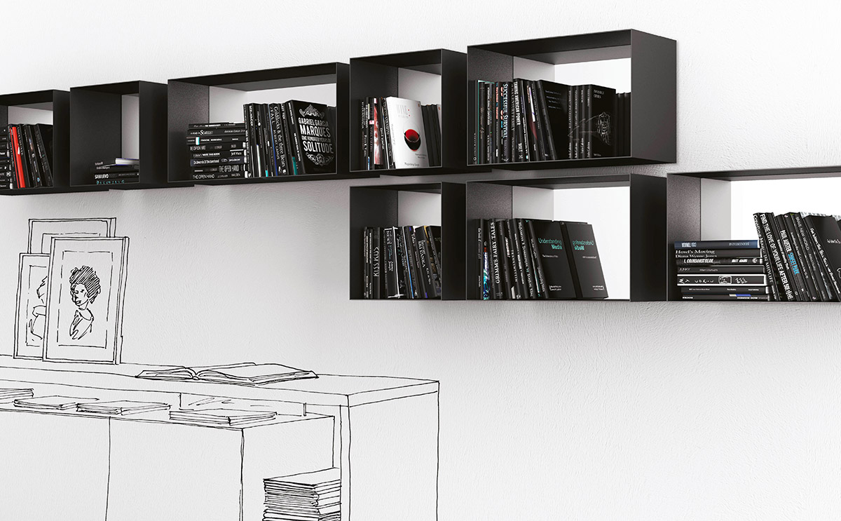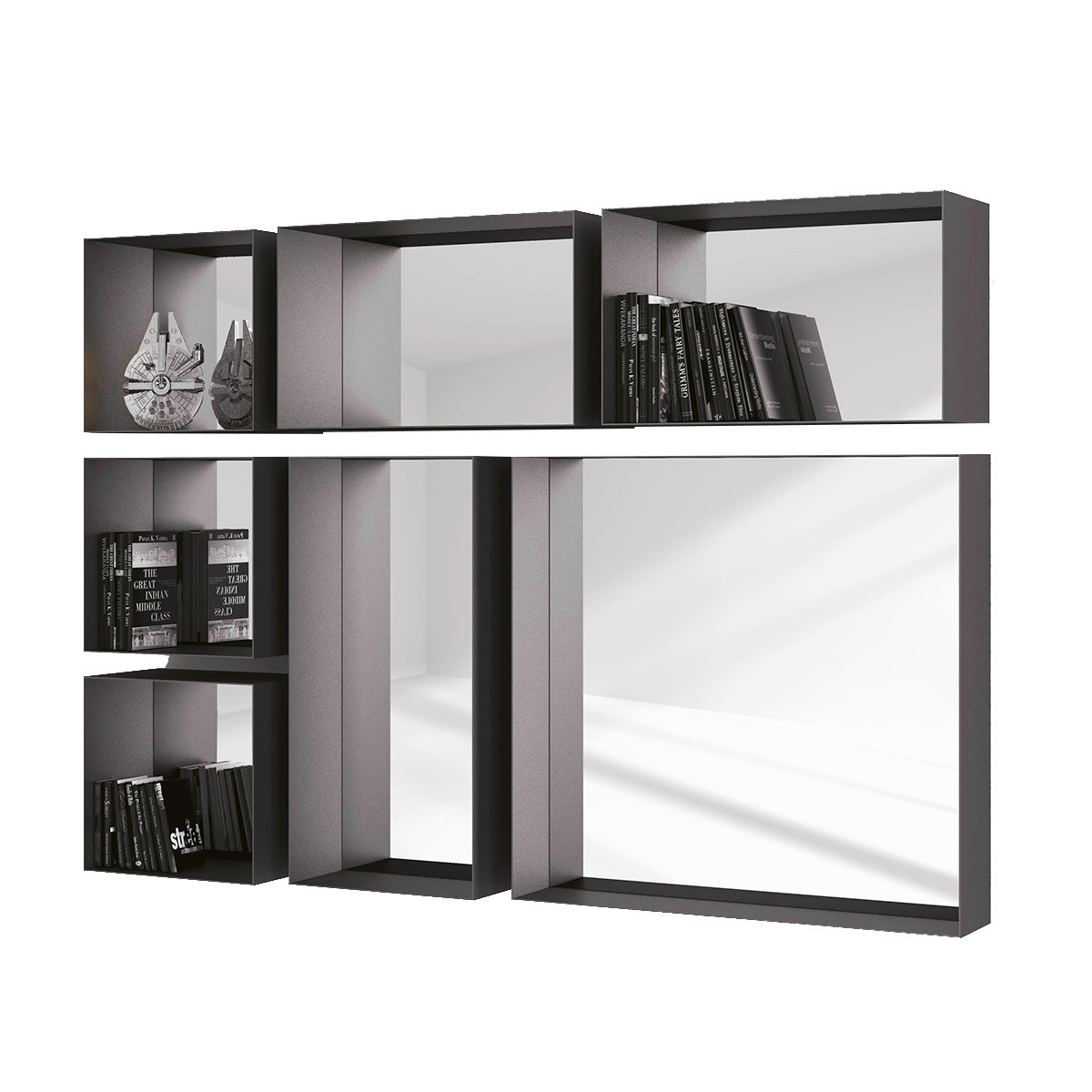 Barra Tasto Specchi componibili è il set di specchi di design quadrangolari a parete in metallo. Finitura goffrata colore antracite.