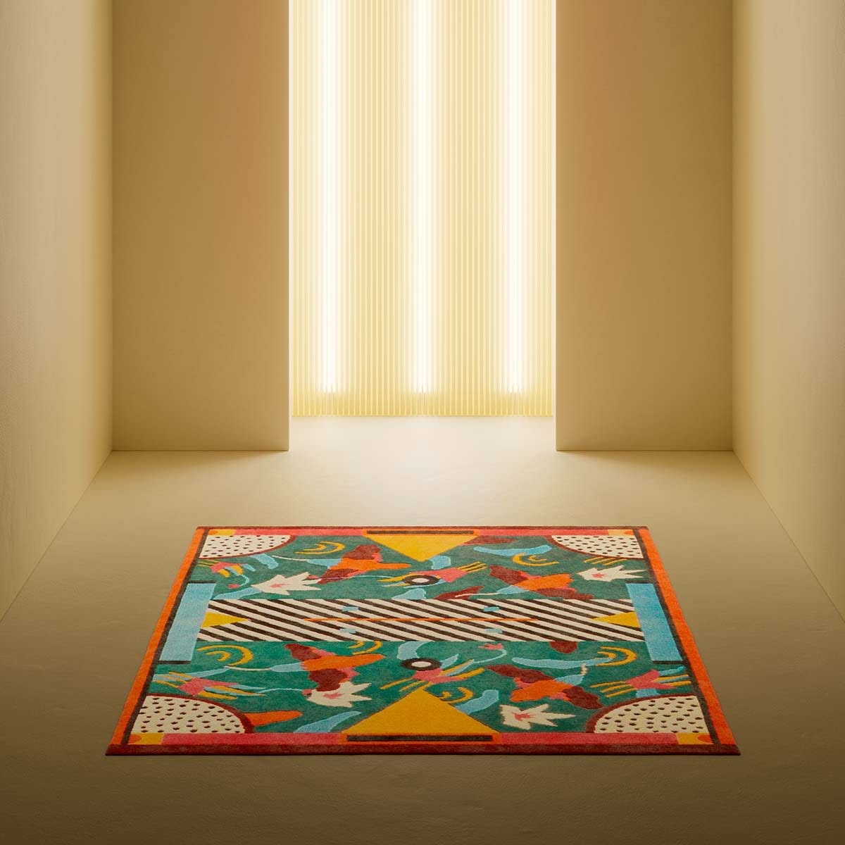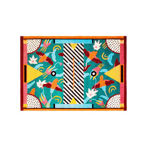Memphis Milano Riviera Tappeto di Nathalie Du Pasquier è un tappeto di design in 100% lana tibetana annodato a mano con telaio artigianale. Disponibile in due misure. Per via della sua fabbricazione artigianale le dimensioni e i colori possono variare dall’immagine. Fiori, frutti ed uccelli convivono assieme a geometrie, linee e pattern tipici di Memphis in questo folle innesto di forme che è Rivera, un tappeto in pura lana realizzato dalla designer francese Nathalie Du Pasquier nel 1983. I toni caldi del turchese, del giallo e dell’arancione armonizzano e regolano l’equilibrio di questi disegni così differenti tra loro. La rigida organizzazione spaziale della composizione viene rotta e mascherata dalla sinuosità delle vibranti forme fitomorfe a metà tra uccelli e fiori esotici, liberi di viaggiare e muoversi sulla superficie.