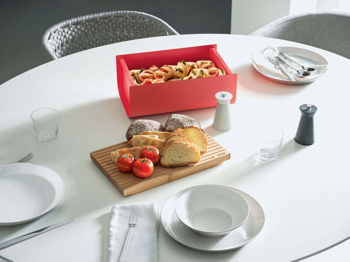 Alessi BG03 R Mattina Cassetta per pane in acciaio colorato Rosso è il cestino portapane di design in acciaio colorato con resina epossidica, Rosso con tagliere in legno di bambù. Lo studio di design BIG-GAME propone un oggetto multiuso disegnato per accompagnare un gesto quotidiano, il consumo del pane, valorizzandone la natura rituale e conviviale. “Mattina” non è un semplice portapane, ma un contenitore il cui coperchio è un pratico tagliere studiato per affettare al meglio il pane senza che le briciole si spargano sul piano. Un oggetto versatile che può essere usato per anche per servire in tavola la colazione. Con “Mattina” lo studio BIG-GAME progetta una tipologia per un rito conviviale, per una piccola cerimonia quotidiana da condividere in famiglia, con amici, con chi si ama. CONSIGLI /SUGGERIMENTI