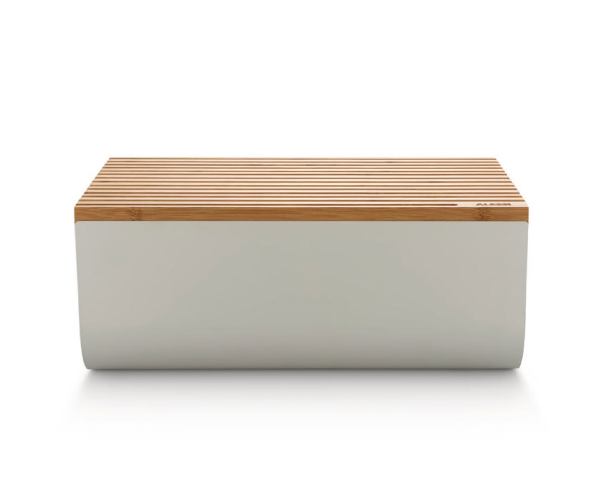 Alessi BG03 R Mattina Cassetta per pane in acciaio colorato Warm Grey BIG-GAME | Cassetta per pane in acciaio colorato con resina epossidica, Warm Grey con tagliere in legno di bambù