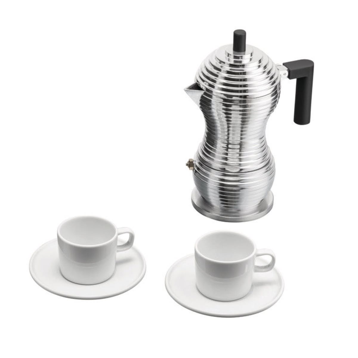 Alessi MDL02BSET Alessi & Coffee Set Pulcina Induzione con 2 tazze da caffè AA.VV | Set Caffettiera a induzione da 3 tazze e due tazze da caffè con sottotazza in porcellana bianca