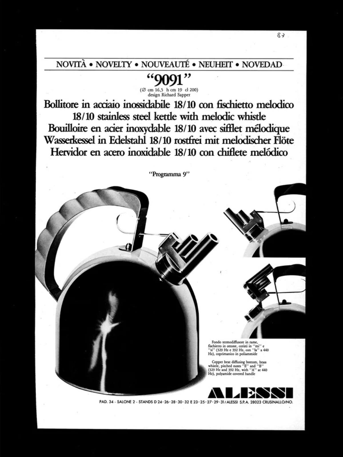 Alessi 9091 FM Bollitore in acciaio Inox è il bollitore di design in acciaio inossidabile 18/10 con fischietto melodico in ottone e manico in PA, nero. Fondo in acciaio magnetico adatto alla cottura ad induzione. Questo bollitore è stato il primo dei nostri bollitori d'autore, inaugurando una stagione felice di progetti di bollitori sia per noi che per molti altri fabbricanti di casalinghi. L'elemento centrale del progetto è il fischietto in ottone nelle canne del quale sono stati inseriti due coristi in mi e in si che, al momento dell'uscita del vapore, producono una piccola, simpatica melodia. Sapper voleva evitare il solito rumore ansiogeno prodotto dagli altri bollitori allora sul mercato, e seguendo questa indicazione di natura squisitamente poetica è nato credo il primo oggetto polisensoriale della Alessi che non interromperà una pausa di piacere con un fischio, ma con un'avvolgente melodia. Richard Sapper l'ha creato ispirandosi a un ricordo d'infanzia, il poetico suono delle sirene dei battelli sul fiume Reno: perché la melodia che accompagna l'uscita del vapore dev'essere gradevole. Questo oggetto è stato mostrato nei film: Generazione 1000 euro (Generazione 1000 euro, M.Venier, 2008); Niente da nascondere (Caché, M.Haneke, 2005).