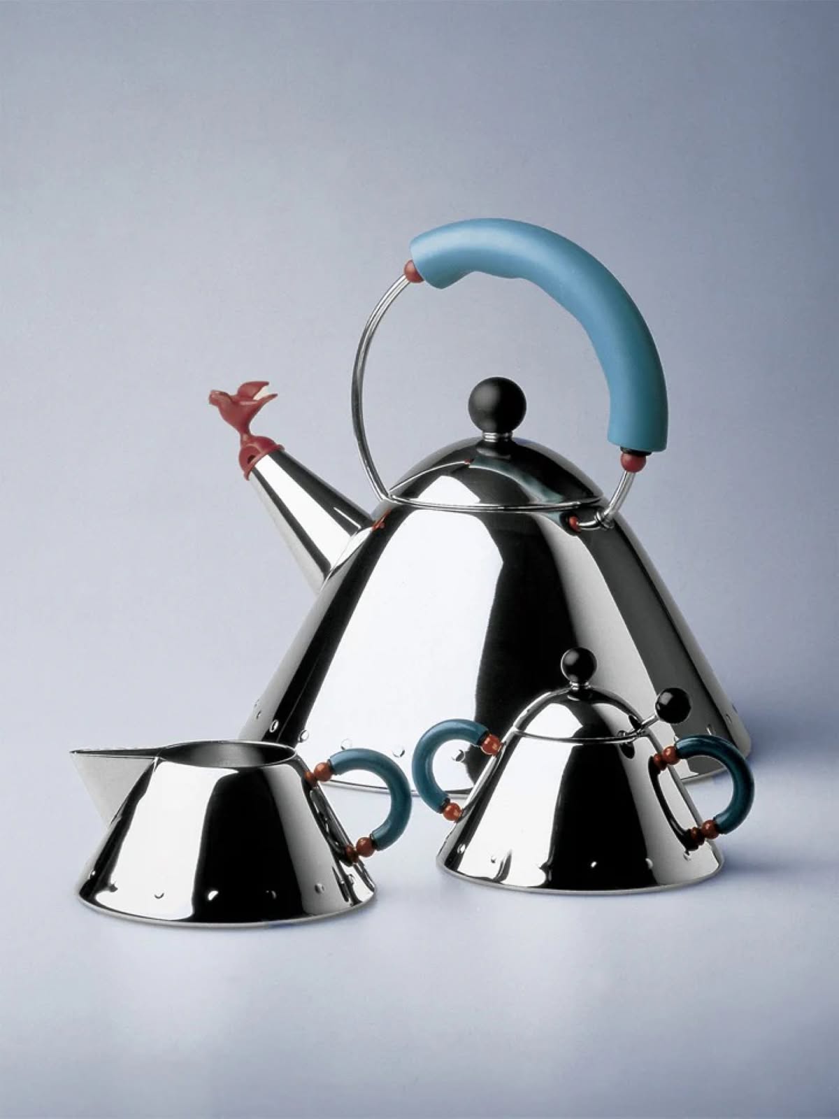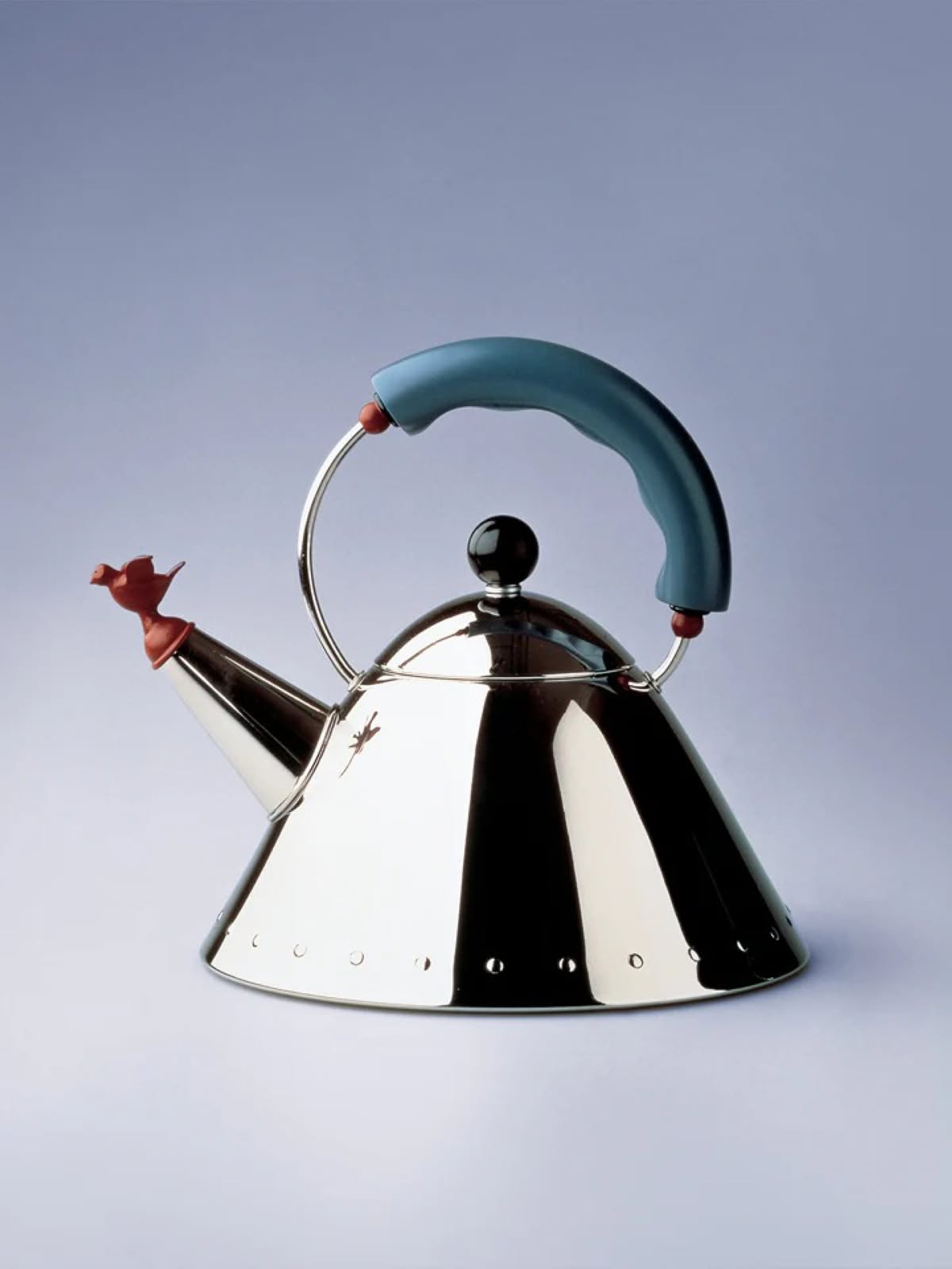 “Il bollitore per il tè è stato progettato per correggere gli errori dei bollitori precedenti i cui manici sporgevano dal corpo, causando bruciature se non erano posizionati correttamente sulla fiamma. Oppure il bollitore che impiegava così tanto tempo a bollire perché non c'era abbastanza acqua alla sua base, o ancora quello che era difficile da sollevare perché il volume non era corretto per le sue dimensioni. Queste erano le questioni principali, le regole di progettazione che dovevano essere prese in considerazione quando abbiamo iniziato il progetto. Per noi la forma del bollitore, una specie di cono, è diventata la più intelligente per sfruttare al meglio il volume e la vicinanza alla fiamma. Una volta deciso questo aspetto, tutto il resto ha cominciato ad andare al suo posto. In questo periodo stavo cercando di decidere il carattere del bollitore. Volevo qualcosa di leggero, non così serio. È così che mi ha affascinato l'idea dell'uccellino. Non sarebbe interessante, pensai, se potessi usare l'acqua per animare l'uccellino appollaiato all'estremità del beccuccio? ” Alex Buck e Matthias Vogt (a cura di), Michael Graves. Designer Monographs 3, Ernst & Sohn 1994.
