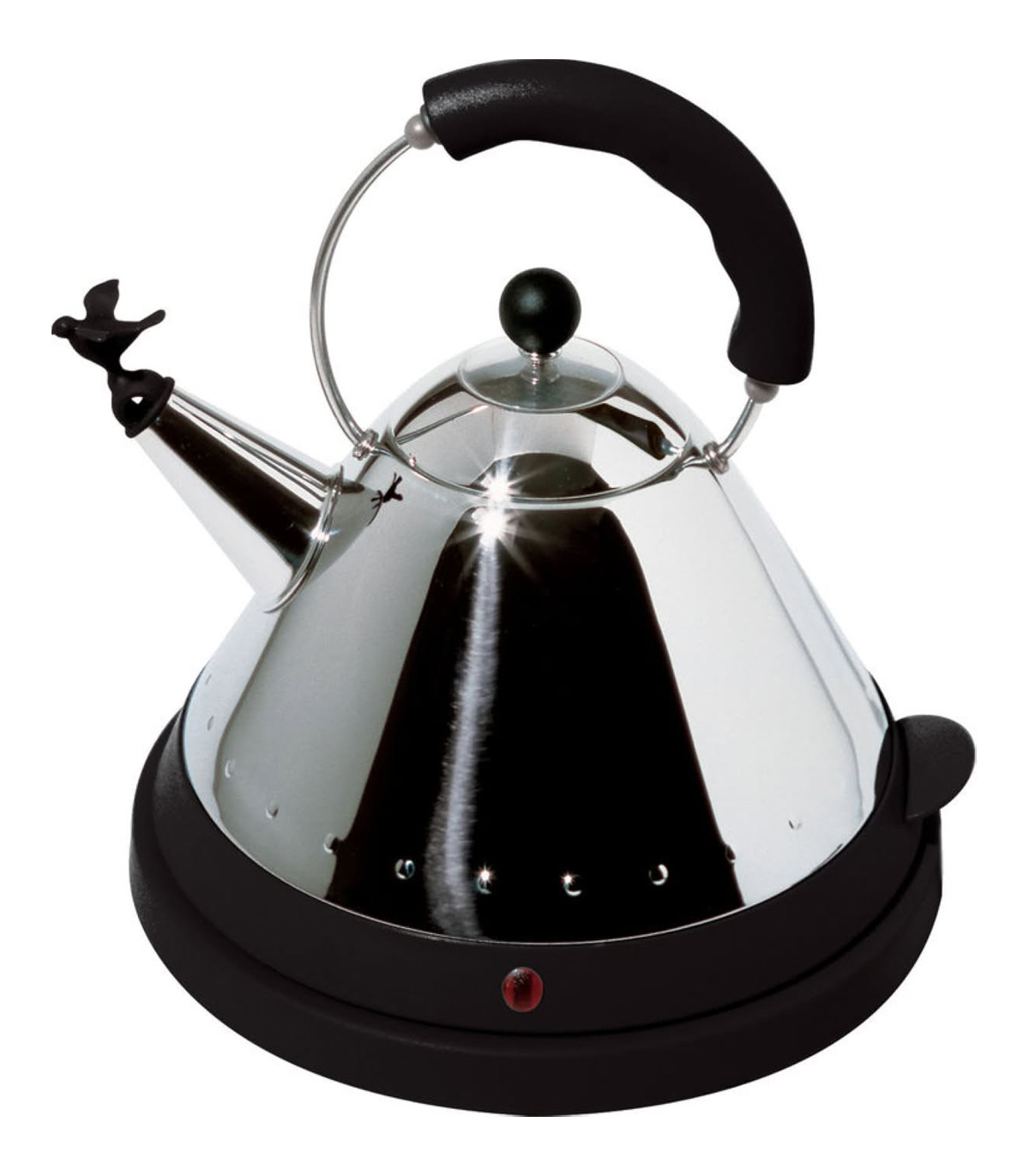 “Il bollitore per il tè è stato progettato per correggere gli errori dei bollitori precedenti i cui manici sporgevano dal corpo, causando bruciature se non erano posizionati correttamente sulla fiamma. Oppure il bollitore che impiegava così tanto tempo a bollire perché non c'era abbastanza acqua alla sua base, o ancora quello che era difficile da sollevare perché il volume non era corretto per le sue dimensioni. Queste erano le questioni principali, le regole di progettazione che dovevano essere prese in considerazione quando abbiamo iniziato il progetto. Per noi la forma del bollitore, una specie di cono, è diventata la più intelligente per sfruttare al meglio il volume e la vicinanza alla fiamma. Una volta deciso questo aspetto, tutto il resto ha cominciato ad andare al suo posto. In questo periodo stavo cercando di decidere il carattere del bollitore. Volevo qualcosa di leggero, non così serio. È così che mi ha affascinato l'idea dell'uccellino. Non sarebbe interessante, pensai, se potessi usare l'acqua per animare l'uccellino appollaiato all'estremità del beccuccio? ” Alex Buck e Matthias Vogt (a cura di), Michael Graves. Designer Monographs 3, Ernst & Sohn 1994.