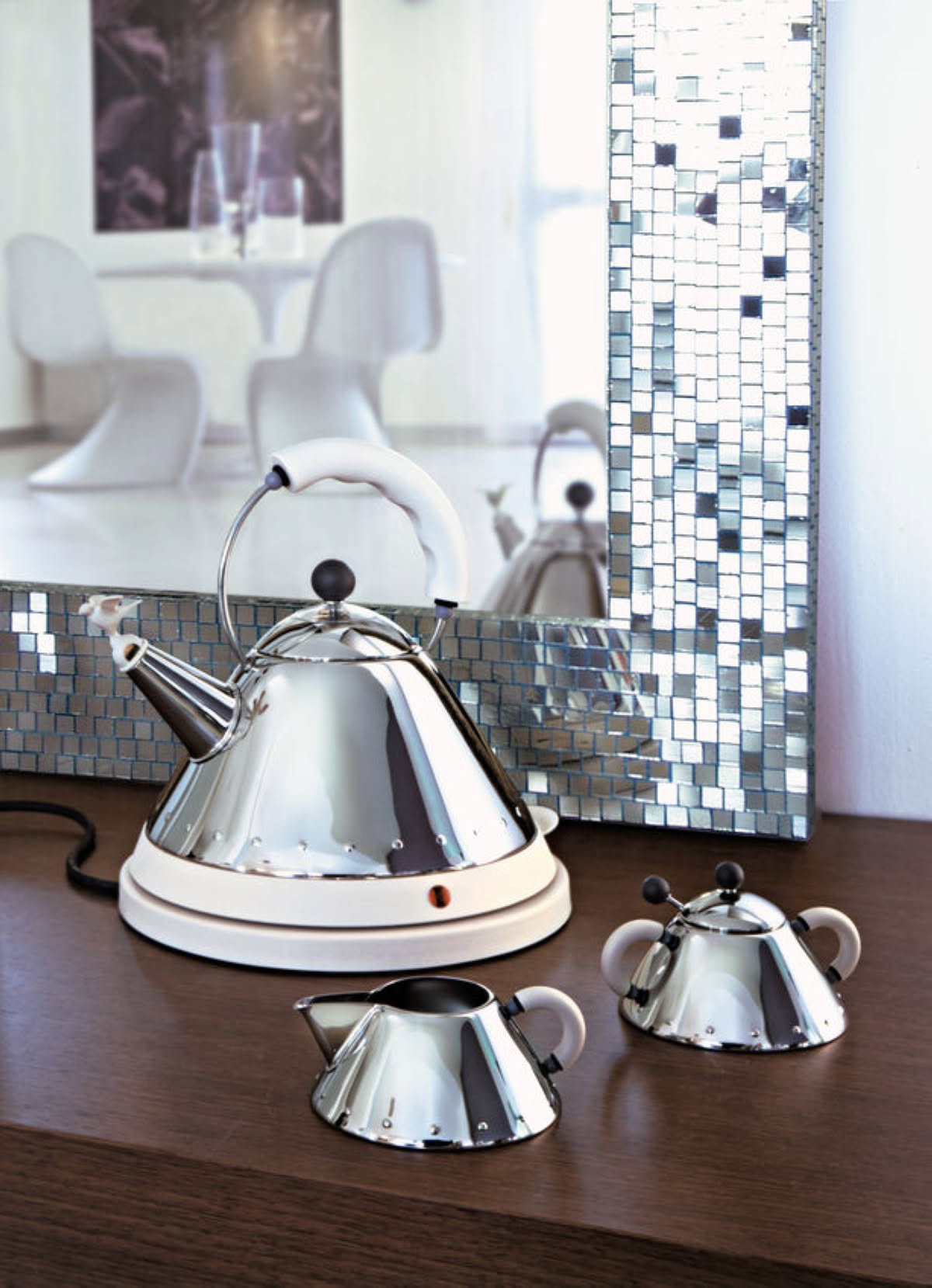 “Il bollitore per il tè è stato progettato per correggere gli errori dei bollitori precedenti i cui manici sporgevano dal corpo, causando bruciature se non erano posizionati correttamente sulla fiamma. Oppure il bollitore che impiegava così tanto tempo a bollire perché non c'era abbastanza acqua alla sua base, o ancora quello che era difficile da sollevare perché il volume non era corretto per le sue dimensioni. Queste erano le questioni principali, le regole di progettazione che dovevano essere prese in considerazione quando abbiamo iniziato il progetto. Per noi la forma del bollitore, una specie di cono, è diventata la più intelligente per sfruttare al meglio il volume e la vicinanza alla fiamma. Una volta deciso questo aspetto, tutto il resto ha cominciato ad andare al suo posto. In questo periodo stavo cercando di decidere il carattere del bollitore. Volevo qualcosa di leggero, non così serio. È così che mi ha affascinato l'idea dell'uccellino. Non sarebbe interessante, pensai, se potessi usare l'acqua per animare l'uccellino appollaiato all'estremità del beccuccio? ” Alex Buck e Matthias Vogt (a cura di), Michael Graves. Designer Monographs 3, Ernst & Sohn 1994.