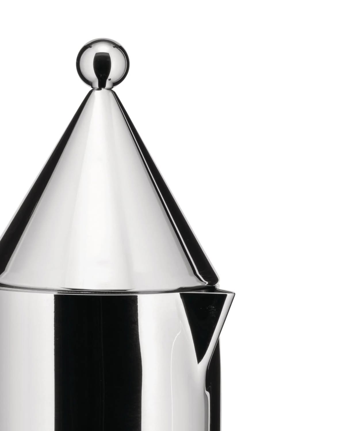 Alessi 90002/6 La Conica Caffettiera espresso 6 tazze è la caffettiera di design in acciaio inossidabile 18/10 con fondo in rame. 6 tazze. Disegnata tra il 1980 e il 1983, questa caffettiera nasce come evoluzione dell’operazione “Tea&Coffee Piazza”, che aveva visto grandi architetti impegnati sul tema della progettazione di un servizio per caffè e tè. E' il primo progetto di Rossi per la grande serie, e con la sua immagine fortemente iconica diventa subito il prodotto leader dell'allora neonato marchio Officina Alessi, nonché un simbolo del design degli anni '80. La conica, primo progetto di caffettiera espresso dell'architetto Aldo Rossi, nasce da un gioco di forme geometriche semplici che formano una mini architettura da tavola, dallo stile conciso ed elegante. Icona intramontabile, La conica ha il corpo in acciaio inossidabile e il fondo in rame: un oggetto ricercato, dalle essenziali linee geometriche che danno vita a uno strumento funzionale con il quale preparare e servire il caffè.