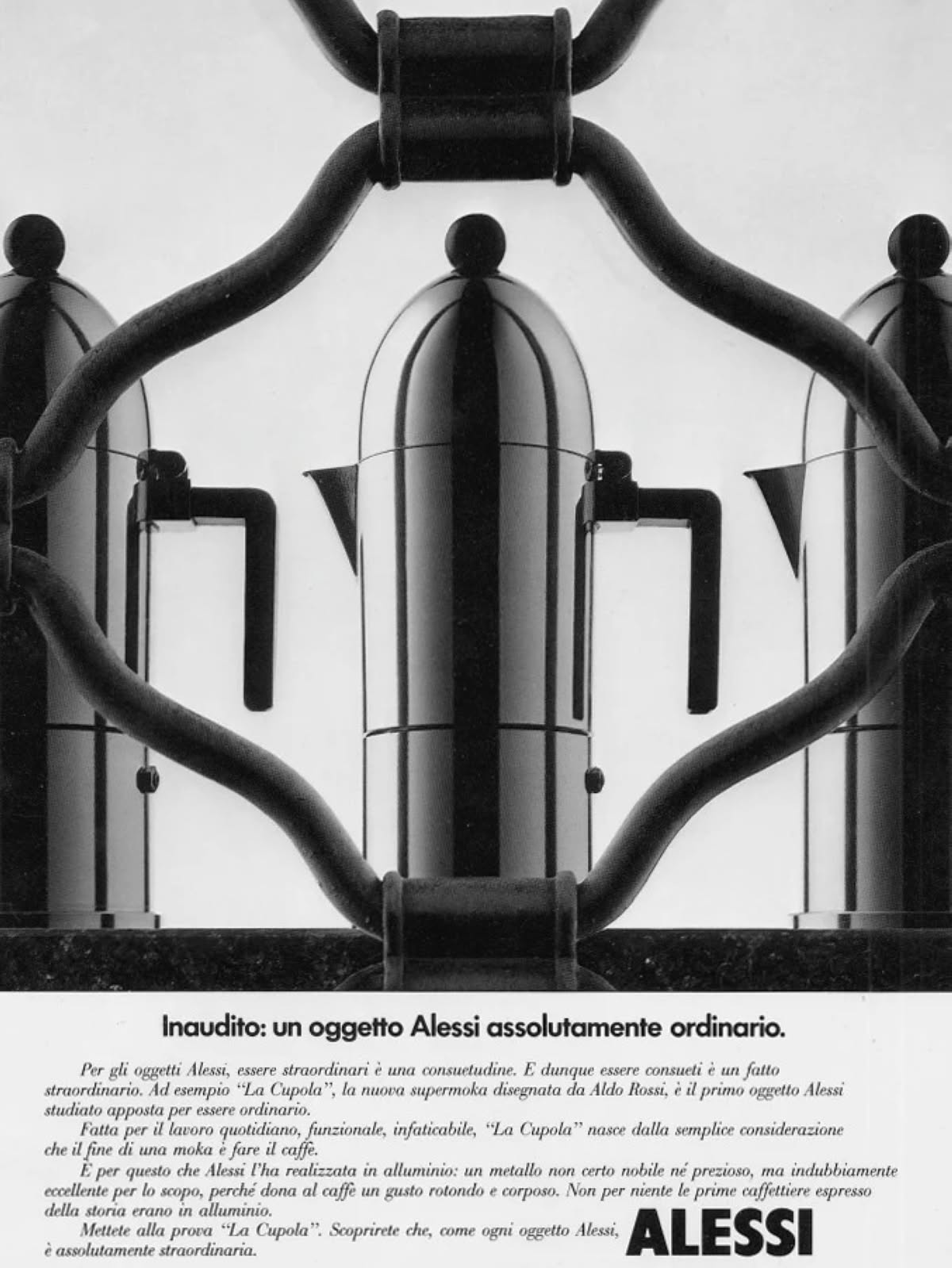“La caffettiera è per me un tipo di costruzione: è una cupola sorretta da un cilindro con determinate modanature, più o meno funzionali e decorative, ma è un’architettura precisa.” Aldo Rossi