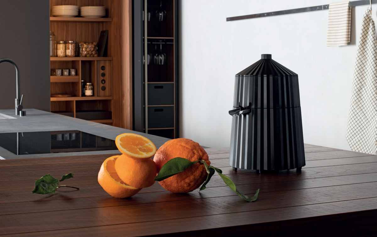 Alessi Plissè MDL07 B Spremiagrumi elettrico Nero è il piccolo elettrodomestico di Design dalla forma decisamente plastica firmato Michele De Lucchi. “Plissé” dichiara già nel suo nome la natura scultorea del suo disegno: come un tessuto che una fitta pieghettatura trasforma in forma tridimensionale, questo bollitore ricorda un abito di alta sartoria, un bellissimo oggetto modellato da uno stilista. Uno splendido oggetto tridimensionale che unisce agli aspetti funzionali un disegno affascinante ed elegante: da lasciare in vista su un piano della cucina per la sua carica formale e decorativa. Lo spremiagrumi elettrico di design Plissé è molto più di un semplice elettrodomestico: è una piccola architettura domestica che aggiunge un tocco di eleganza alla tua cucina. Il suo design ricercato rappresenta un felice connubio tra moda e design, trasformando ogni spremuta in un'esperienza di haute couture. Pratico da utilizzare e facile da pulire, lo spremiagrumi Plissé diventa un oggetto irrinunciabile per coloro che amano circondarsi di bellezza e curano ogni dettaglio della propria abitazione. Aggiungi un tocco di stile e prenditi cura di te stesso con lo spremiagrumi elettrico di design Plissé. Uno spremiagrumi elettrico che sembra un modello di architettura e non lascia dubbi sul suo autore: Michele de Lucchi, architetto di formazione che nel corso della sua versatile carriera ha attraversato con successo i molteplici ambiti del mondo del progetto, ha disegnato per Alessi questo elettrodomestico unico, che si presenta come un affascinante edificio dallo stile contemporaneo. ELEMENTI. Composto da un coperchio, una calotta spremitrice, un filtro a setaccio in acciaio, un contenitore con beccuccio versatore in acciaio, un corpo motore la cui base è provvista di uno scomparto avvolgicavo. NOTE DI DESIGN. Elegante: un oggetto dal disegno ricercato, un felice incontro tra moda e design. Sorprendente: il coperchio sfaccettato di questo spremiagrumi lo rende sempre pronto all’uso e lo trasforma in una piccola architettura domestica da lasciare in vista per la sua intensa carica formale e decorativa. Irrinunciabile: per chi ama circondarsi di bellezza prendendosi cura di sé, del proprio stile di vita e di ogni dettaglio della propria abitazione. Testato e certificato per garantire la sicurezza del consumatore. Una base antiscivolo ne assicura la stabilità durante l’utilizzo. La resina termoplastica usata per produrre i contenitori è sicura per alimenti. Inodore, insapore e totalmente priva di Bisfenolo A (BPA free). È riciclabile al 100%. RAEE (WEEE) inserita nella confezione. Proposto in un packaging con cartone riciclato, decorato con uno schizzo originale dell’autore.