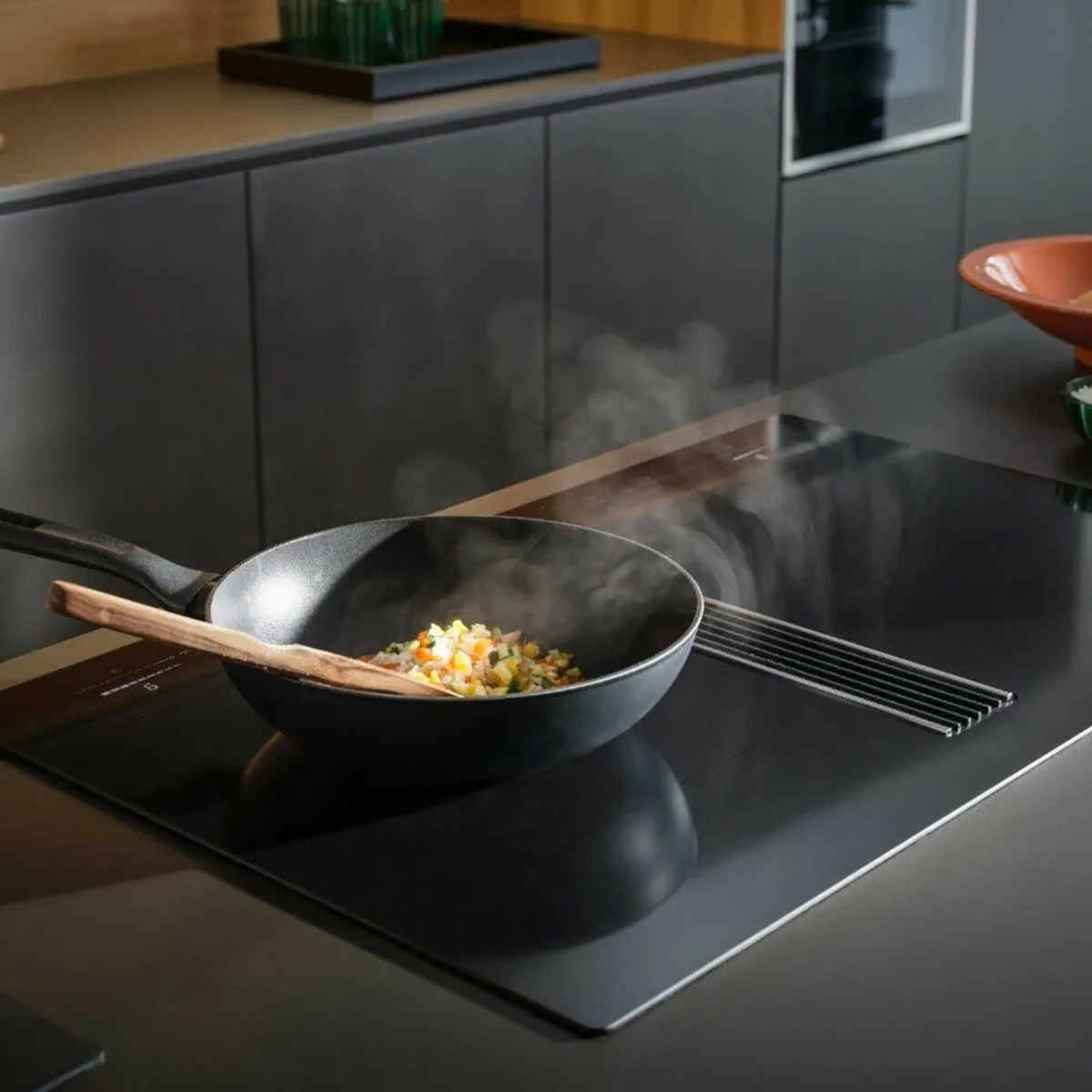 WATERPROOF - Eventuali fuoriuscite di liquidi in cottura confluiscono nella griglia d’aspirazione e scompaiono nel vano a svuotamento automatico sotto la cappa, lasciando spazio per un cassetto portautensili