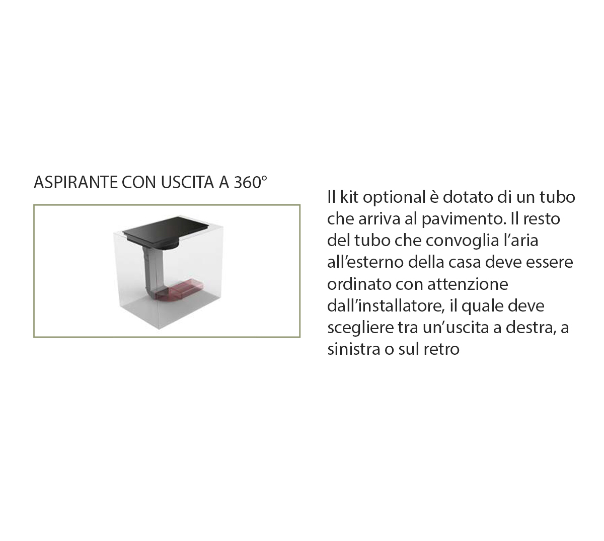 Versione: Aspirante (per poter collegare il piano all'esterno dell'abitazione è necessario l'acquisto separato del Kit di installazione aspirante laterale cod. 112.0711.356)