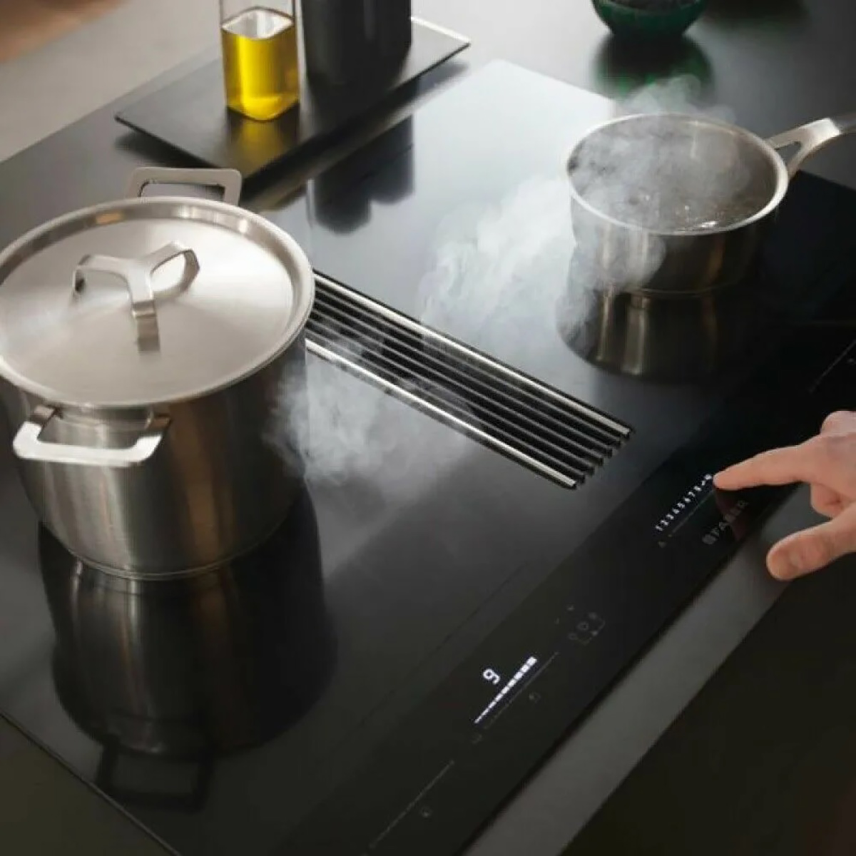 WATERPROOF - Eventuali fuoriuscite di liquidi in cottura confluiscono nella griglia d’aspirazione e scompaiono nel vano a svuotamento automatico sotto la cappa, lasciando spazio per un cassetto portautensili