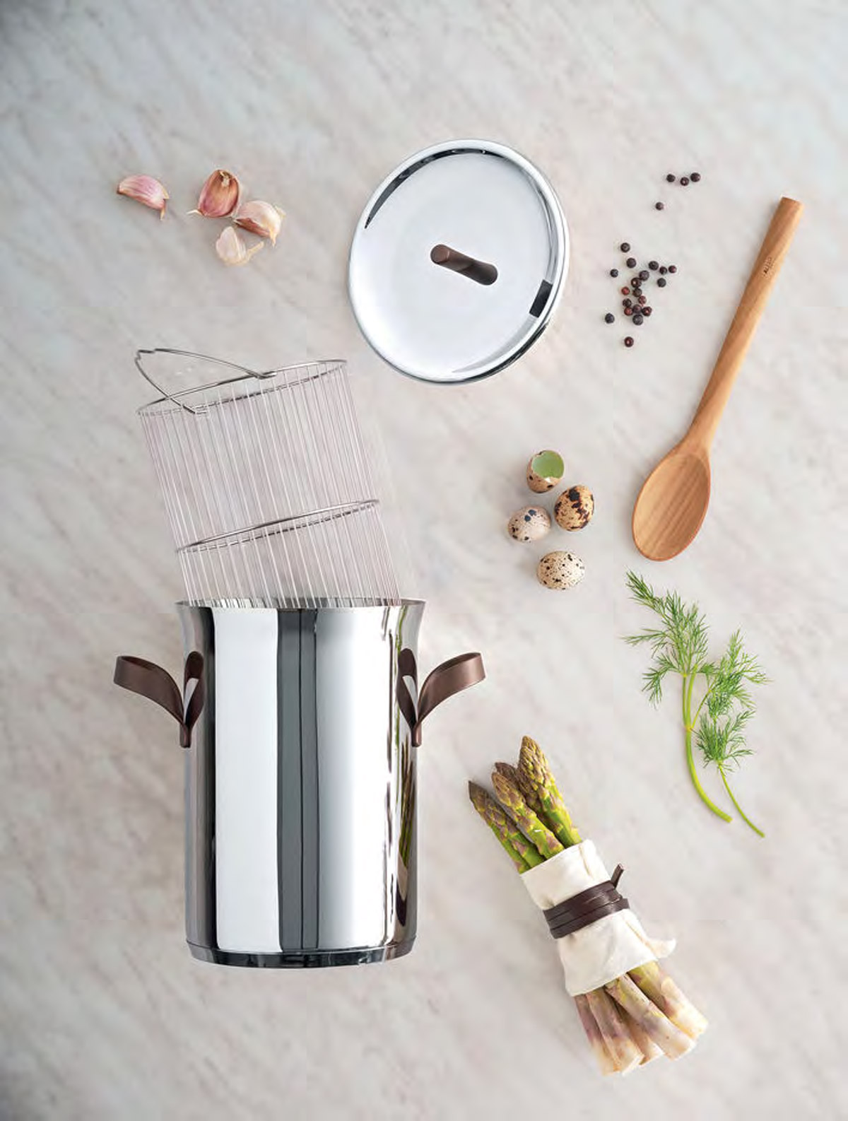 Alessi PU100S7 Edo Set di pentole è il set di pentole di design composto da pentola (PU100/20), casseruola a due manici (PU101/20), casseruola bassa a due manici (PU102/24), casseruola a manico lungo (PU105/16), 3 coperchi (PU200/16, PU200/20, PU200/24) in acciaio inossidabile 18/10. Manici e pomolo in acciaio inossidabile 18/10 con rivestimento in PVD, marrone. Fondo in acciaio magnetico adatto anche alla cottura a induzione. Disegnate da Patricia Urquiola, le pentole Edo nascono da una serie di riferimenti culturali e suggestioni formali diverse. Una ricchezza e varietà che l’autrice tratta con tocco divertito e giocoso, una combinazione di riferimenti che evoca l’essenza stessa del cucinare: l’unione di ingredienti differenti che crea le pietanze. Edo è l’antico nome di Tokyo e il riferimento al Giappone per questo progetto nasce da una serie di pentole che Patricia Urquiola utilizza nella sua cucina. Acquistate in Giappone, queste pentole hanno un disegno semplice e aggraziato che ha ispirato le forme della serie Edo. L’idea della designer è stata quella di addolcire un progetto di produzione industriale con una alcuni tratti che stemperassero il rigore delle regole imposte dalla fabbricazione in serie: in particolare, la leggera svasatura dei recipienti e il disegno delle maniglie che ricordano dei nastri appuntati al corpo delle pentole. Una forma, quella dei manici, che non sembra realizzata industrialmente ma frutto di un lavoro artigianale. Il nome Edo rimanda anche al latino “edere”, ossia “mangiare”, ed esprime ulteriormente quell’incontro di culture differenti che ha ispirato l’intero progetto. La forma concava e il pomolo dei coperchi, infine, evocano un basco adagiato su un piano: un richiamo alle radici basche di Patricia Urquiola. Una serie ricca anche per quanto riguarda l’assortimento: presentando numerose tipologie, declinate in diverse dimensioni e materiali, Edo permette di scegliere l’utensile più adeguato ai differenti tipi di cottura. Fra le tipologie della serie Edo, una pentola in acciaio inossidabile proposta in due dimensioni.