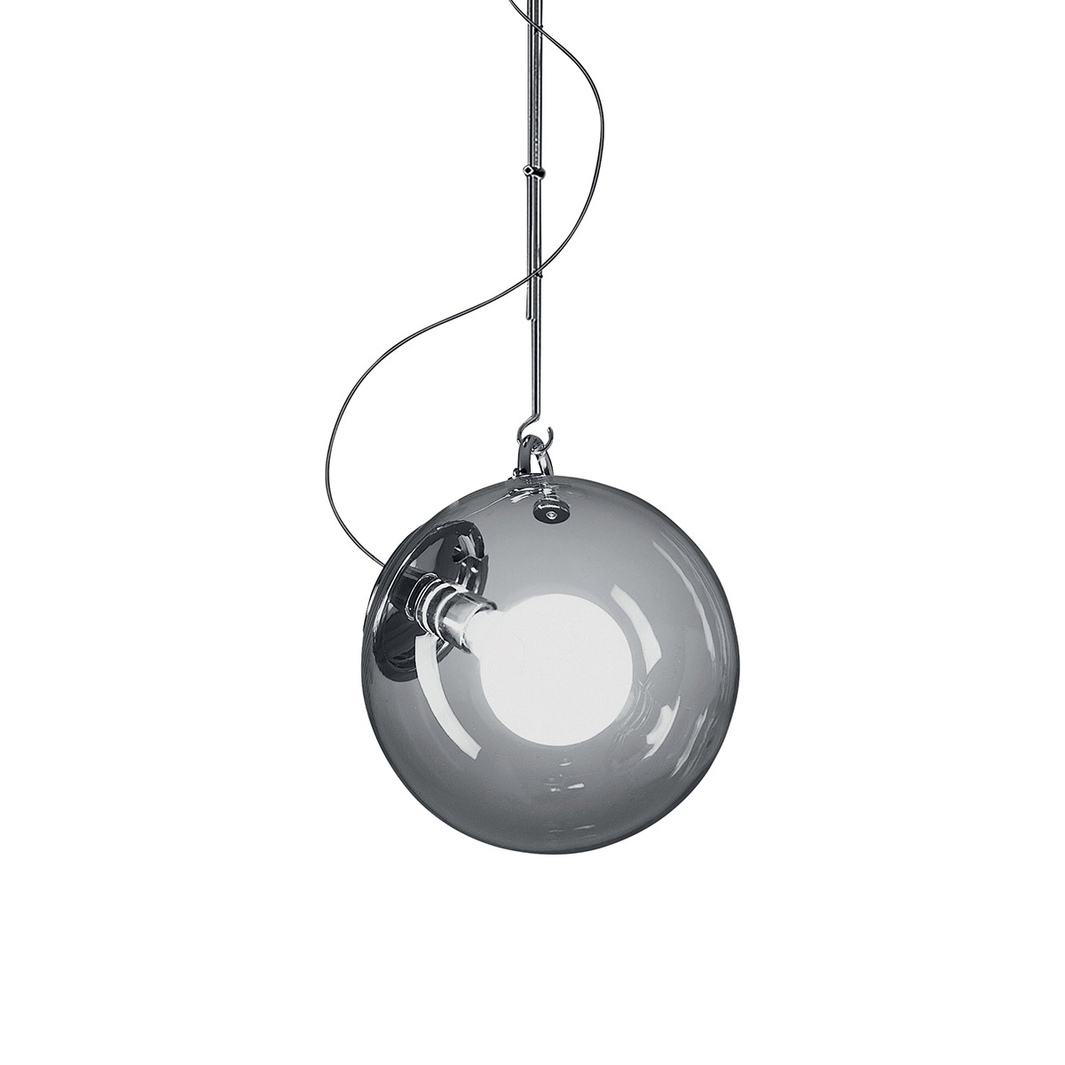 Artemide Miconos lampada a sospensione è la lampada a sospensione con diffusore in cristallo, struttura cromo lucido oppure ottone satinato. La forma a sfera in vetro soffiato trasparente ne denota l'estrema leggerezza ed eleganza accentuata dai dettagli in acciaio del cavo sospeso e del portalampada che ne accennano il carattere sofisticatamente indutriale.