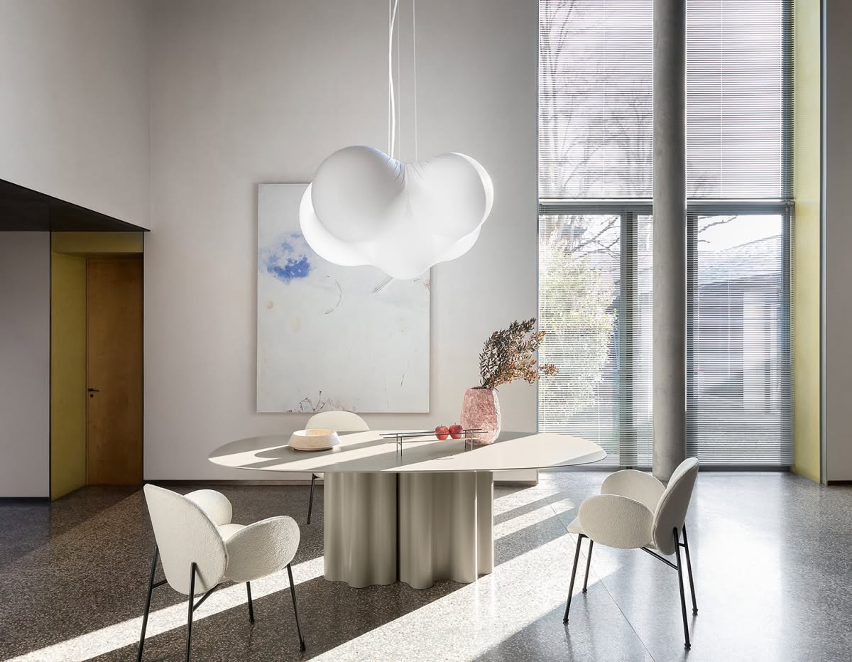 Cloudy Lampada a sospensione è la lampada a sospensione tra design e arte. Cloudy evoca una prodigiosa scultura luminosa contemporanea che domina lo spazio con il suo forte potere installativo ed una fluttuante presenza scenica di grandissimo impatto. Tra design e arte.