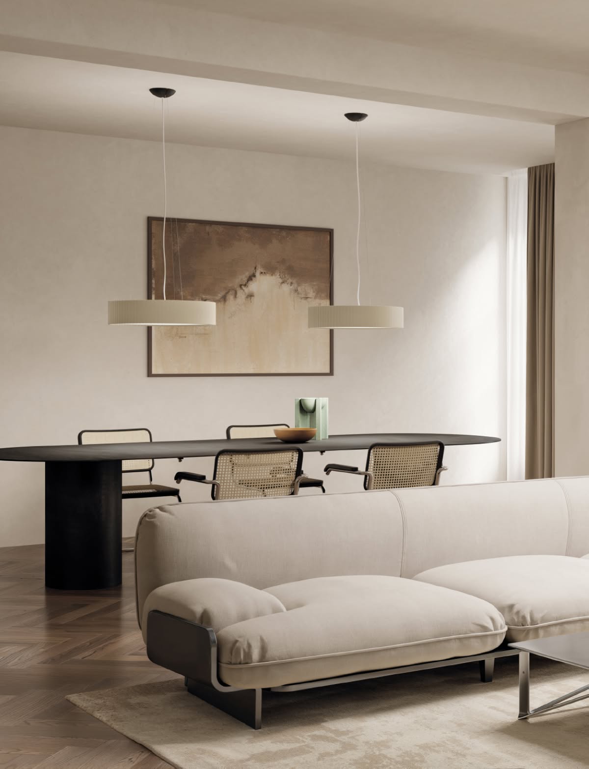 Tessy Pongè Lampada a sospensione è la lampada a sospensione dove un disco avvolto nel tessuto combina l’eleganza della tradizione aziendale con la più recente tecnologia luminosa. Nasce una collezione nella quale la forma lascia spazio al dettaglio, e la luce diventa protagonista.
