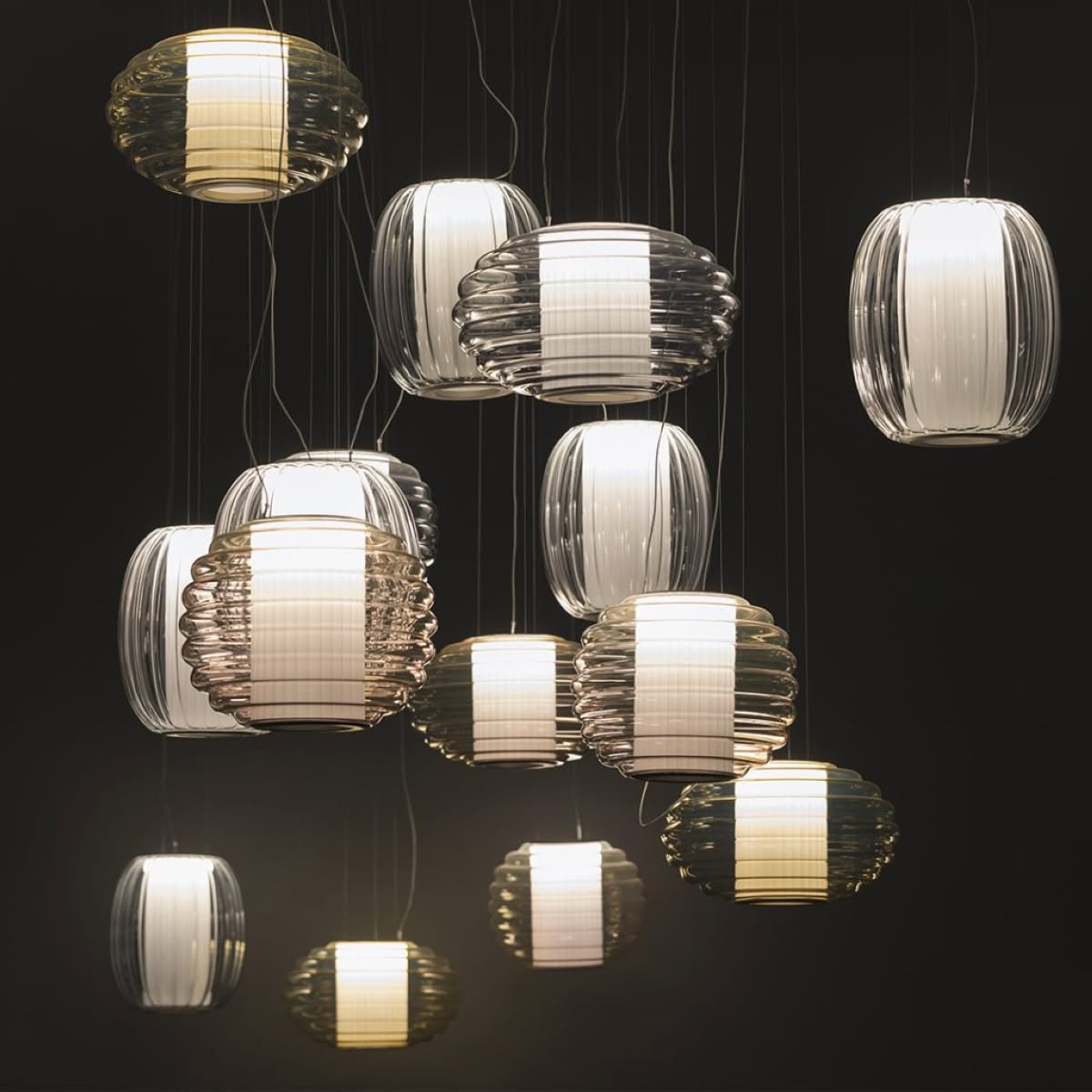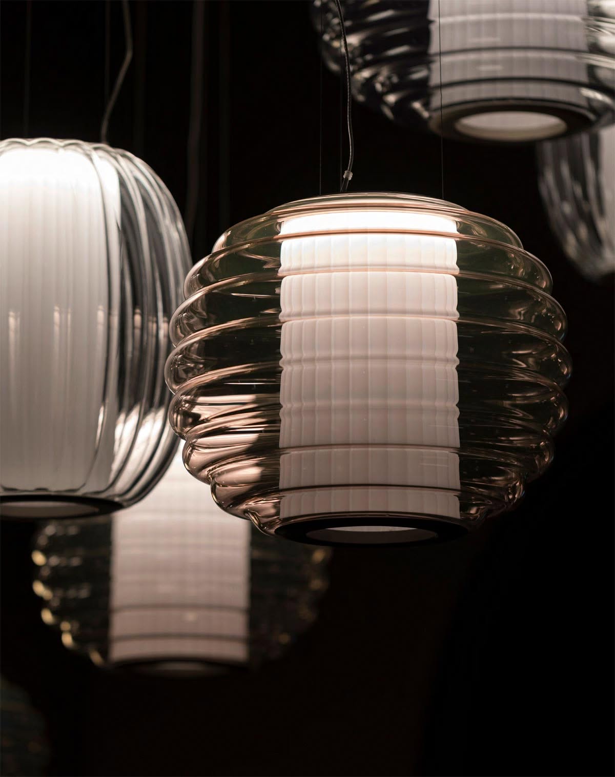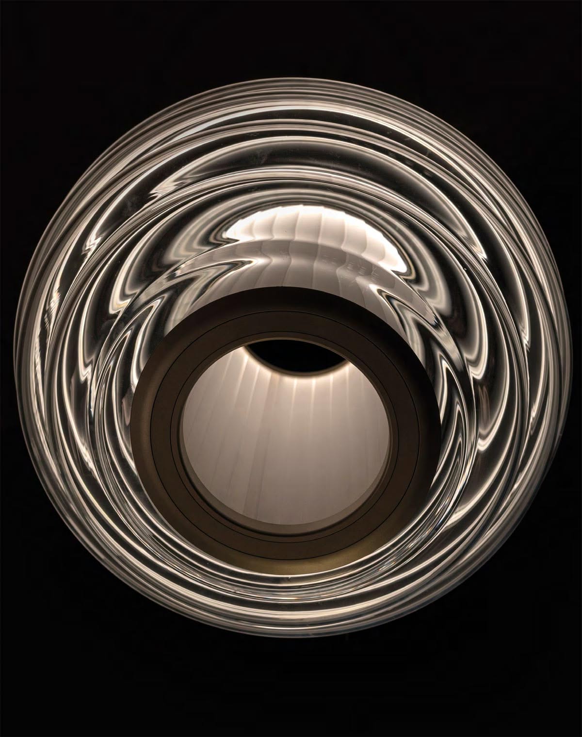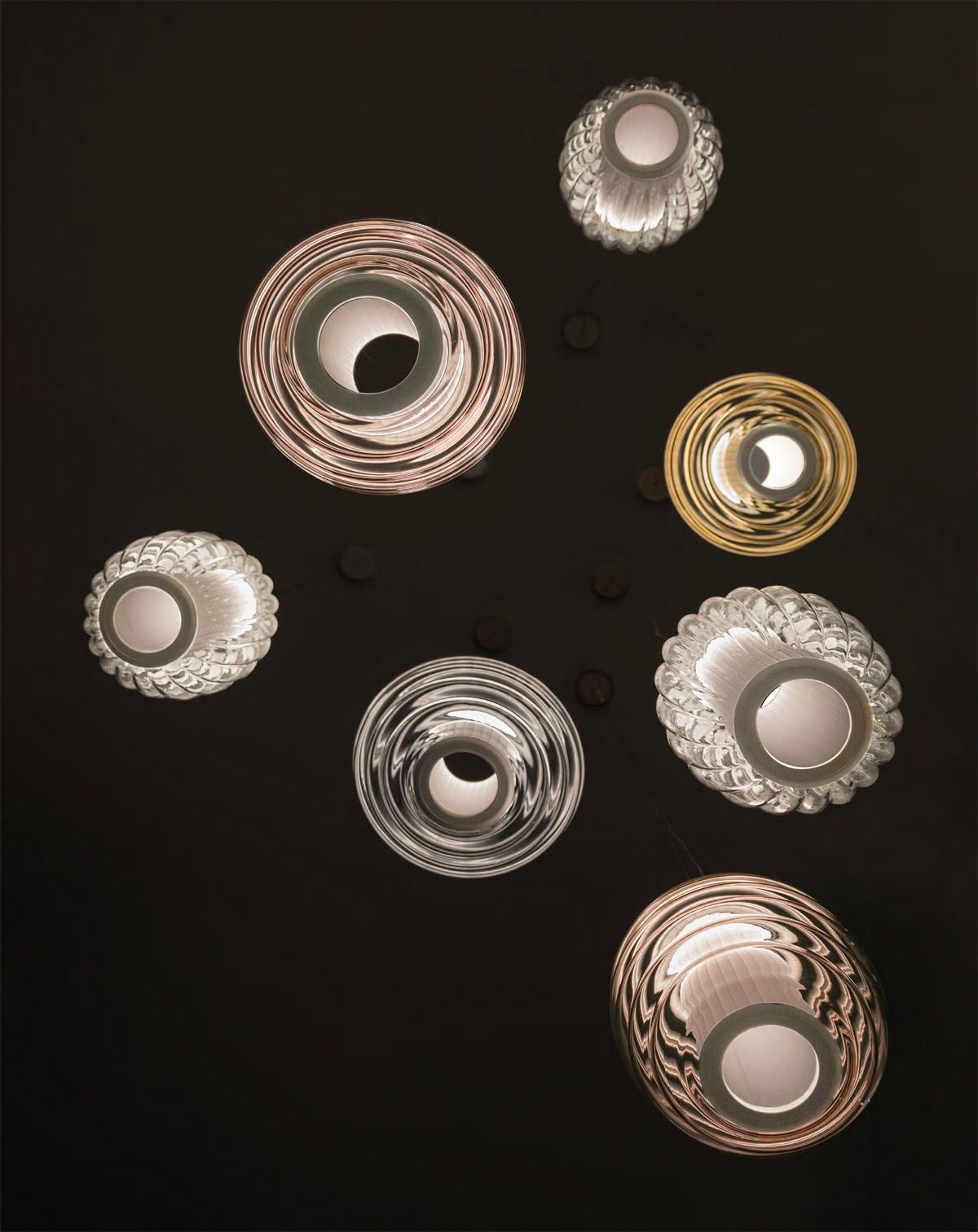 "Abbiamo voluto unire due elementi artigianali, il diffusore bianco effetto plissé e la bolla di vetro soffiato, per creare un dialogo tra tradizione e innovazione. L'idea era di far emergere la magia di due materiali classici, che si riscoprono e si trasformano insieme, dando vita a una luce poetica, capace di emozionare e sorprendere." Gabriele Chiave, Co-founder e Creative Director di Controvento.