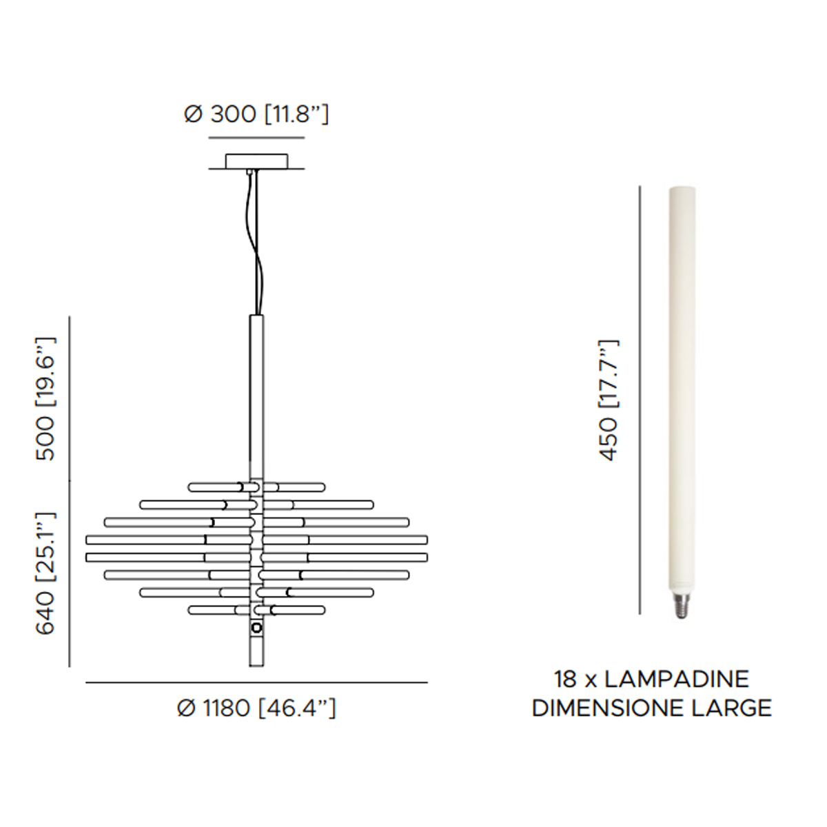 Fonte luminosa: 18x5.6 W Lampadine LED custom tubolari E14 (incluse) - 24V Fonte luminosa: 18 x 490 Lm (8.820 Lm tot.) 3.000 K | CRI >90 Dimmerabile taglio di fase/Triac 640