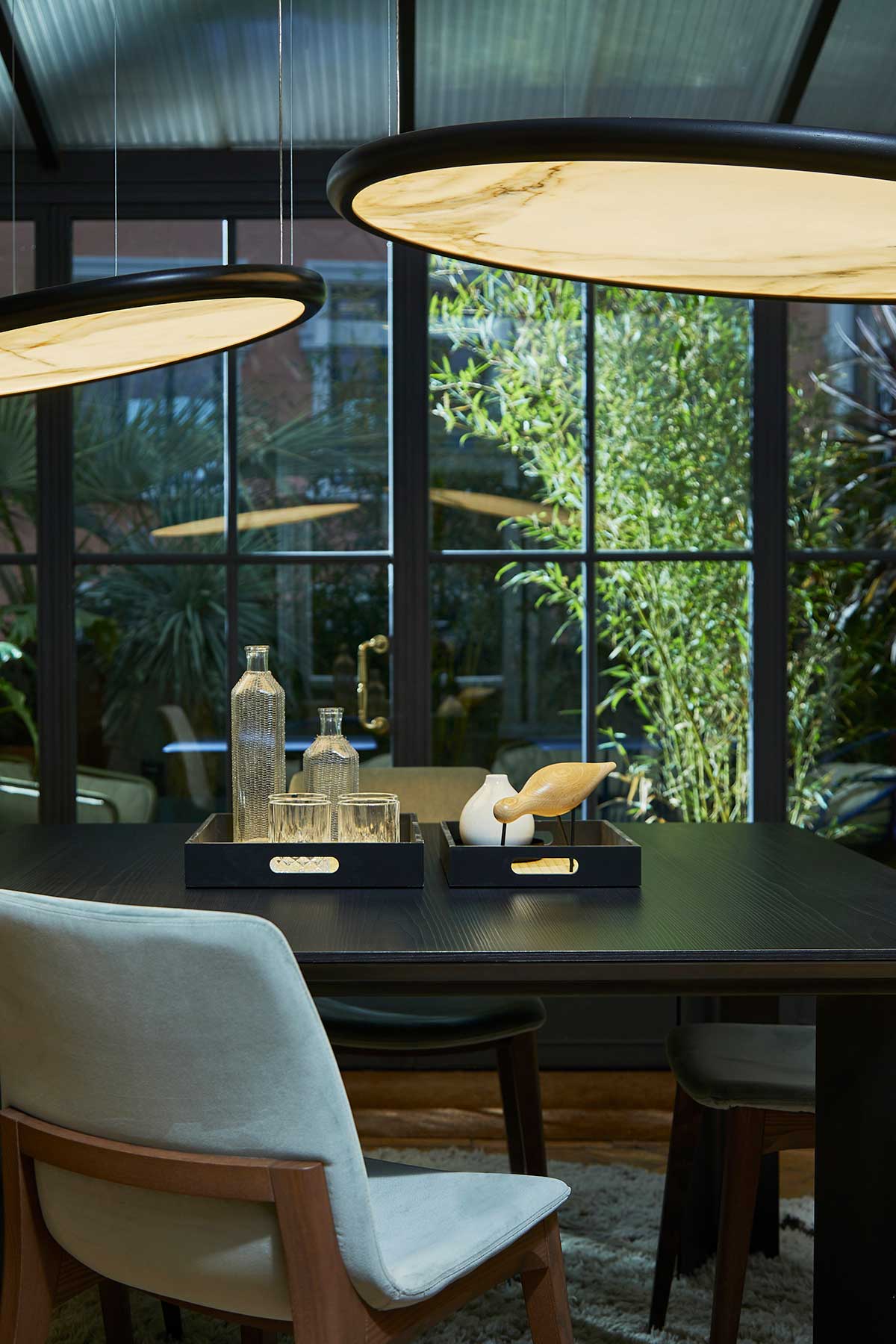 Bogotà Small lampada a sospensione di Contardi è la lampada a sospensione elemento leggero, fluido come un oggetto lanciato in alto e che resta sospeso. Un’idea di leggerezza e allo stesso tempo di materia che dichiari la sua contemporaneità e che si inserisca nei nostri interni con decisione ed eleganza. La parte luminosa rivestita in paglia di Vienna inserita in questo ovale laccato nero ha un sapore vintage e molto attuale, uno stile che ci rimanda ad alcuni interni degli anni 60-70 del modernismo brasiliano e sudamericano. La versione con la parte centrale rivestita in tessuto stampa marmo è più assoluta ma sempre identificativa ed attuale. Disponibile anche con paralume in tessuto di cotone bianco. Bogotà è un nome rotondo, morbido che rappresenta perfettamente questa lampada.