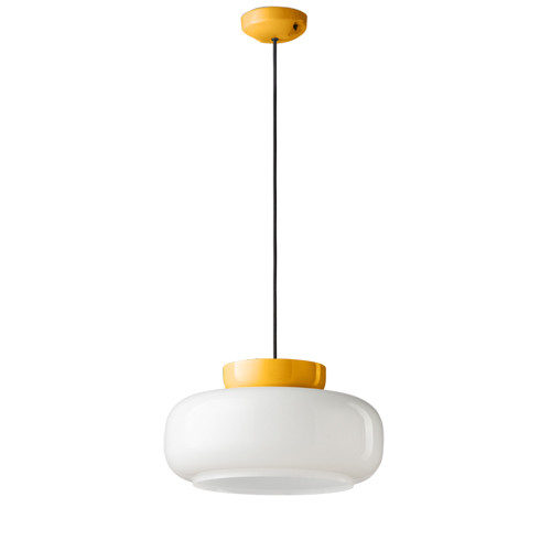 Lampada a sospensione Maracanà C2743 Decò di Ferroluce è la lampada a sospensione costituita da due parti: quella superiore in ceramica e dalla forma a ciotola e quella inferiore in vetro bianco latte che richiama, con il suo aspetto circolare leggermente rialzato, la costruzione degli stadi e delle arene. Da qui il nome della lampada, riferito allo stadio brasiliano per eccellenza: Maracanà.