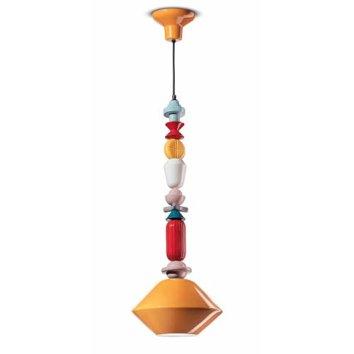Lampada Lariat C2512 Decò di Ferroluce è la lampada a sospensione dove come in un gioiello, i suoi brillanti elementi ceramici si susseguono verticali a formare una variegata catena multicolore, che procede alternando le geometrie sino ad arrivare all’elemento più prezioso che si trova alla sua estremità e che contiene l’elemento luminoso. Lariat esiste in diverse versioni e varianti, a comporre diverse lunghezze e tipologie di impiego, tutte composte da piccole perline ceramiche con smaltatura lucida e colori freschi e contemporanei.