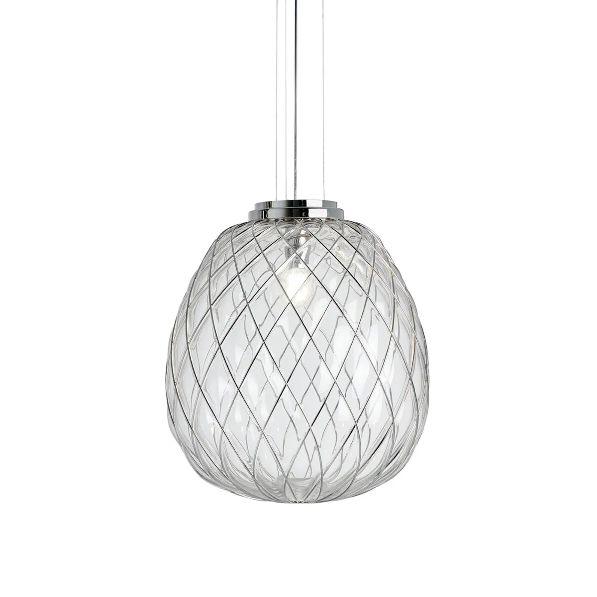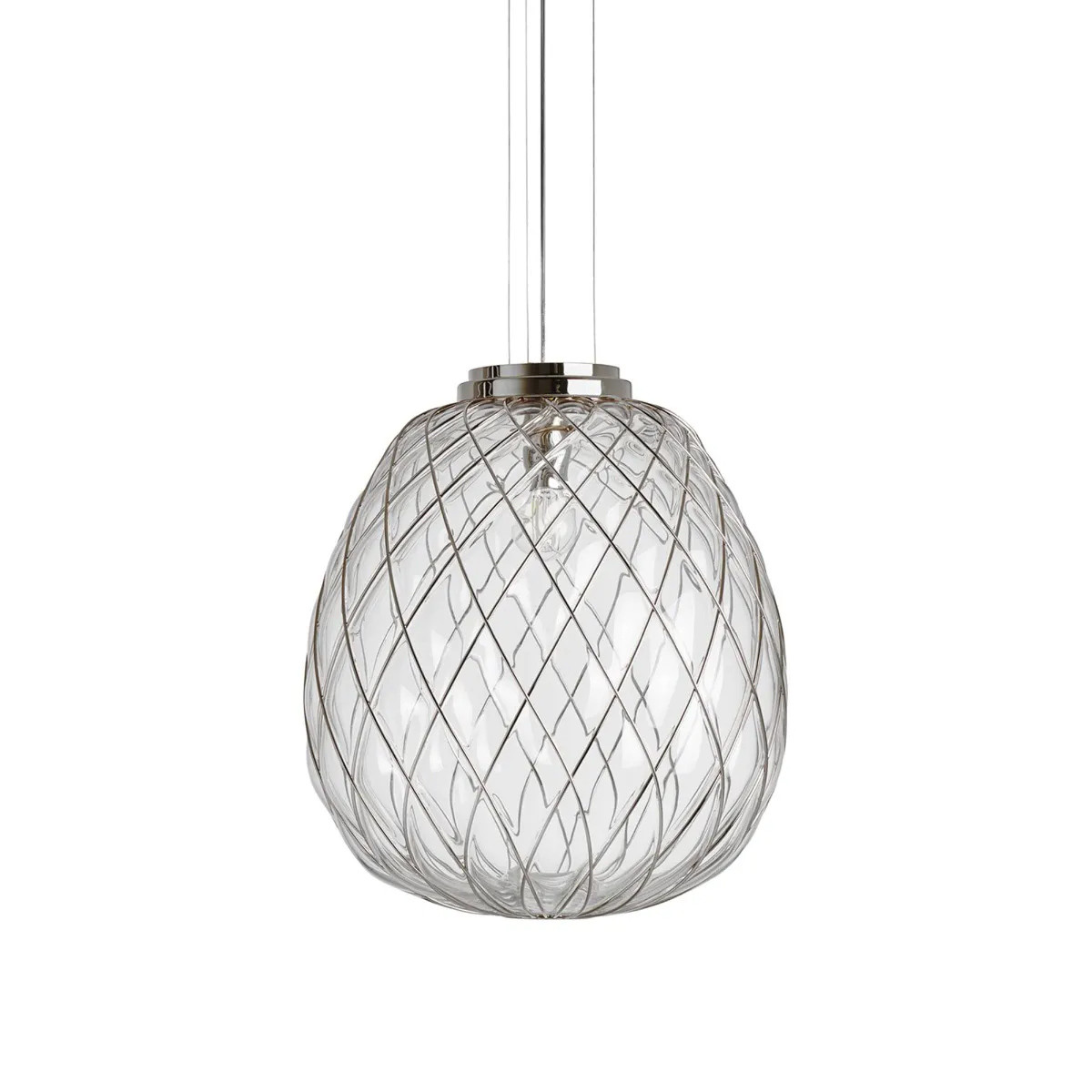 FontanaArte Pinecone Grande trasparente, cromo lampada a sospensione è la lampada di design a luce diffusa dimmerabile. Diffusore in vetro soffiato acidato ingabbiato. Gabbia e base in metallo cromato. Cavi di sospensione in acciaio. Cavo di alimentazione trasparente. Rosone in metallo verniciato. Fonte luminosa non inclusa.