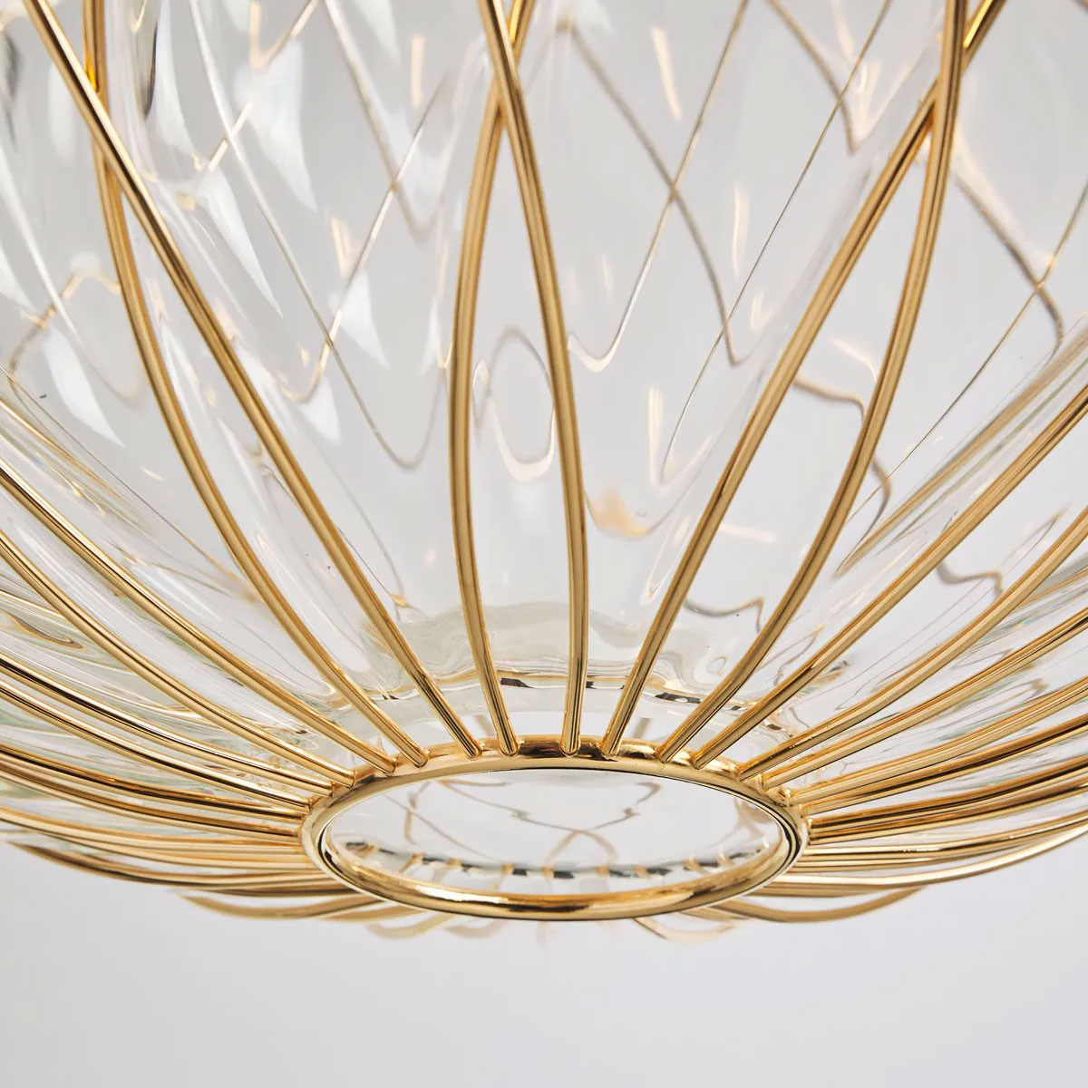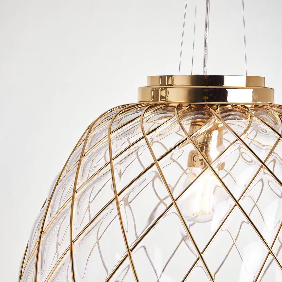 FontanaArte Pinecone Grande trasparente, oro lampada a sospensione è la lampada di design a luce diffusa dimmerabile. Diffusore in vetro soffiato acidato ingabbiato. Gabbia e base in metallo galvanizzato. Cavi di sospensione in acciaio. Cavo di alimentazione trasparente. Fonte luminosa non inclusa.