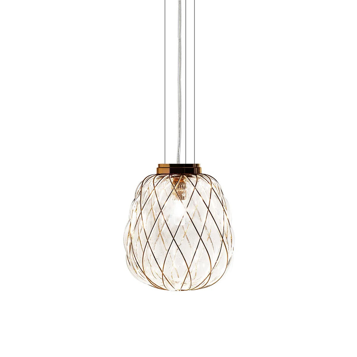 FontanaArte Pinecone Media trasparente, oro lampada a sospensione è la lampada di design a luce diffusa dimmerabile. Diffusore in vetro trasparente ingabbiato. Gabbia e base in metallo galvanizzato. Cavi di sospensione in acciaio. Cavo di alimentazione trasparente. Fonte luminosa non inclusa.