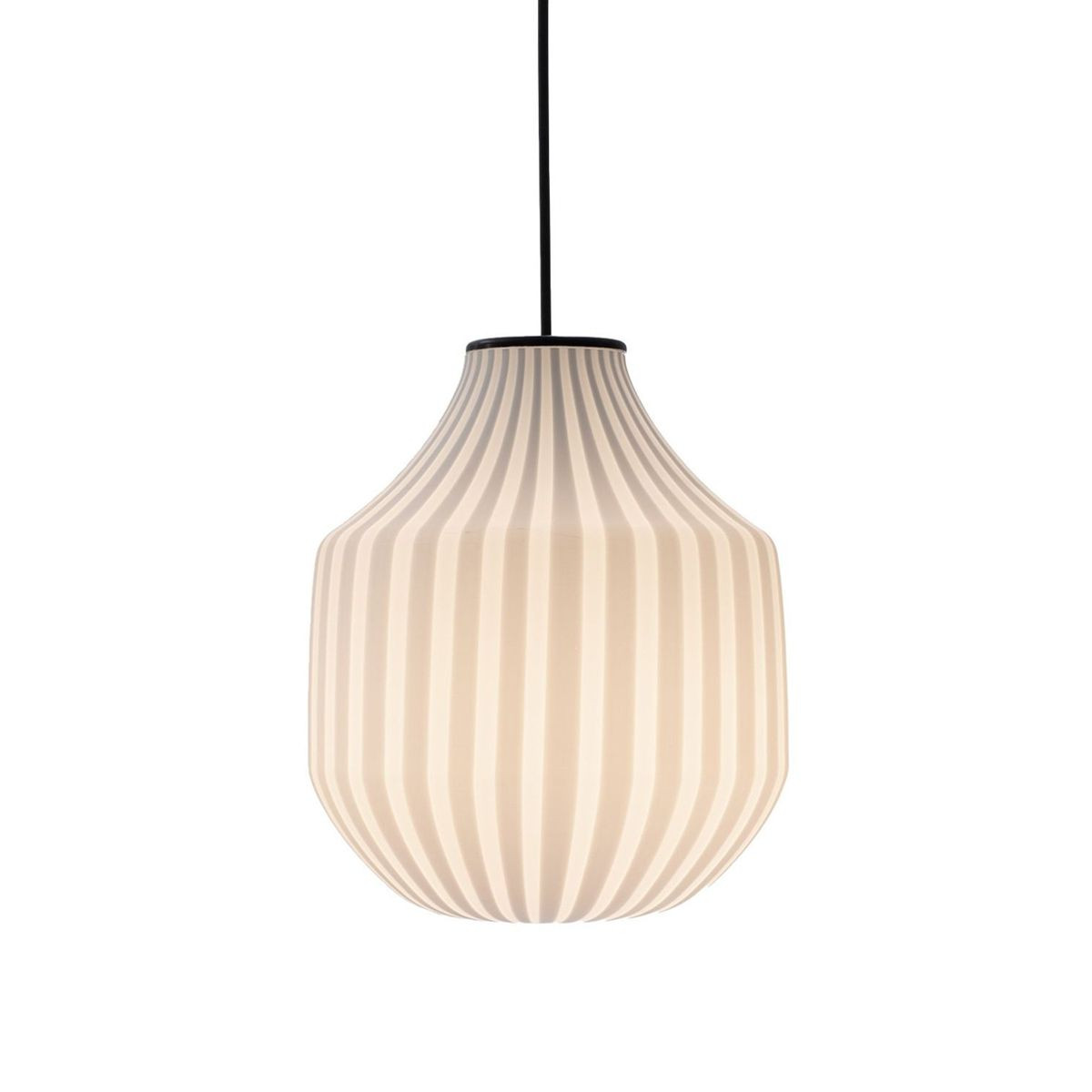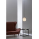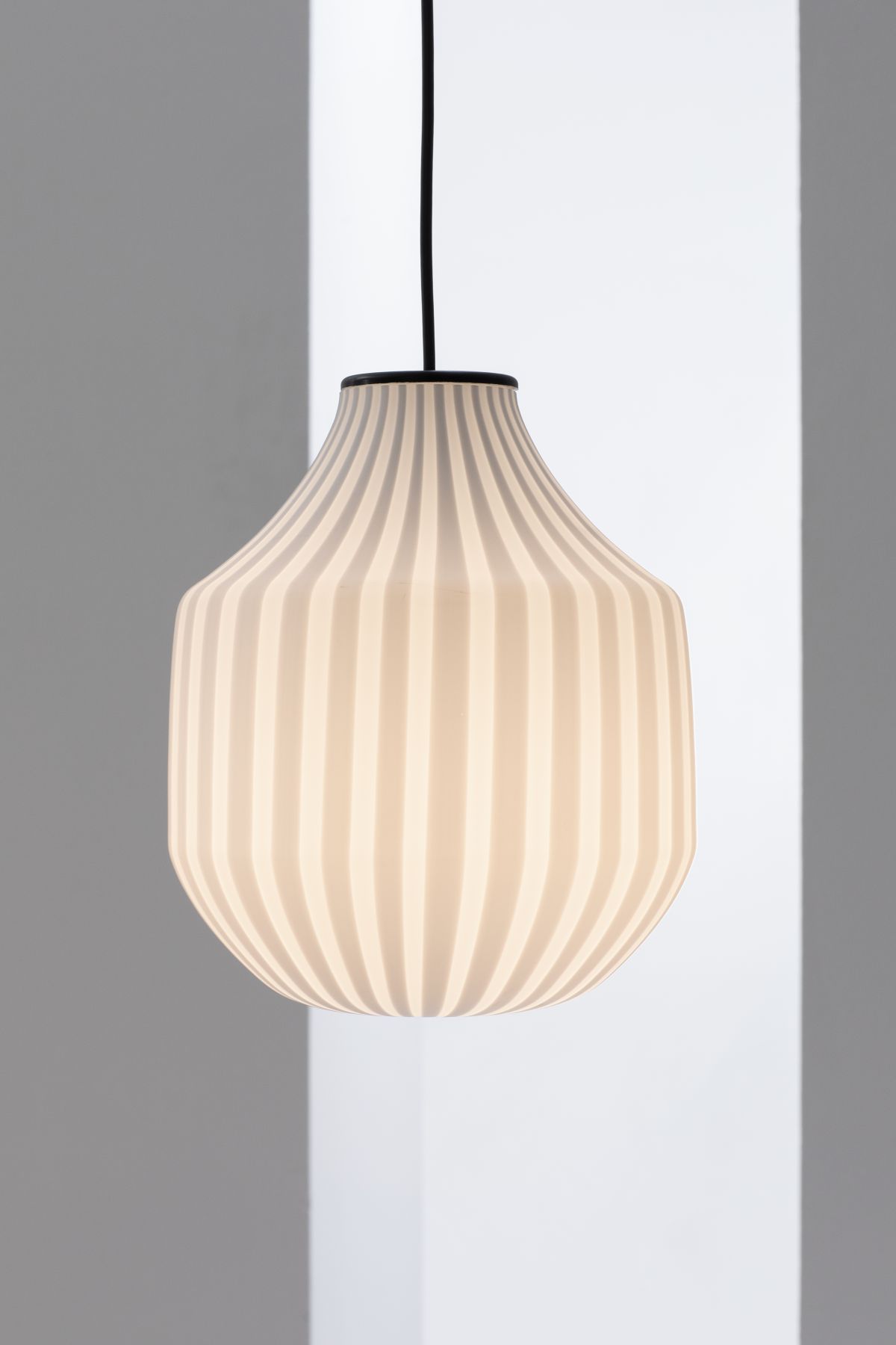 Materiale: paralume in vetro bianco in filigrana, coperchio in alluminio nero opaco e rosone in metallo nero opaco