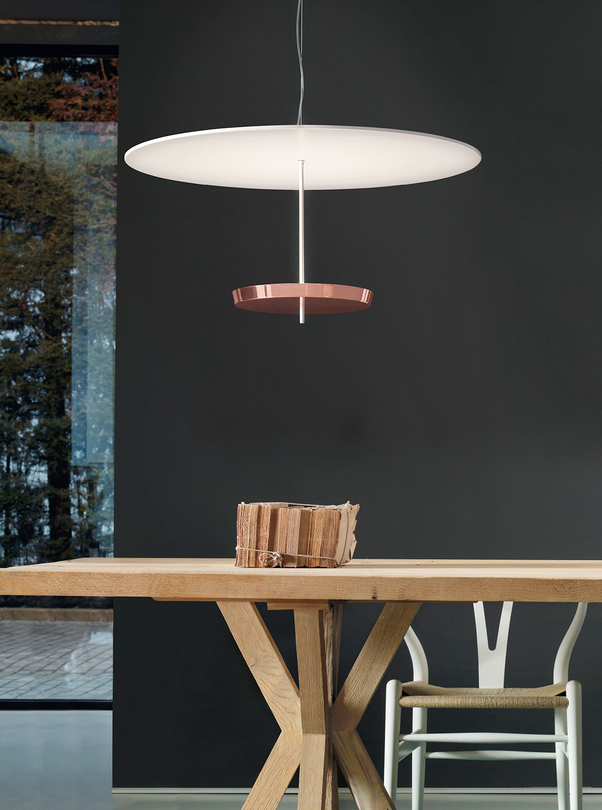Ombrella Ø 60 lampada a sospensione è la lampada a sospensione in metallo verniciato. Lo scambio di riflessi e rimbalzi tra le due superfici sovrapposte illumina lo spazio in modo indiretto con una luce diffusa e accogliente.