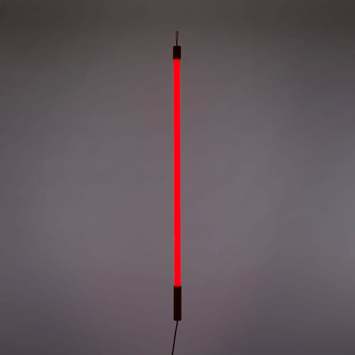 Linea Led Red Seletti di Selab + Alessandro Zambelli è la lampada da terra a forma di neon disponibile in 6 colorazioni. Può essere appesa grazie ad un’asola in cuoio, attaccata con viti e filo trasparente o posizionata sulla base di legno da comprare separatamente.