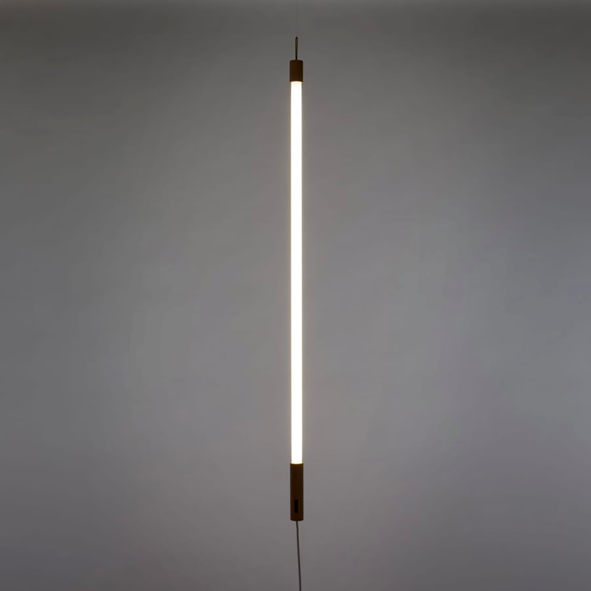 Linea Led White Seletti di Selab + Alessandro Zambelli è la lampada da terra a forma di neon disponibile in 6 colorazioni. Può essere appesa grazie ad un’asola in cuoio, attaccata con viti e filo trasparente o posizionata sulla base di legno da comprare separatamente.