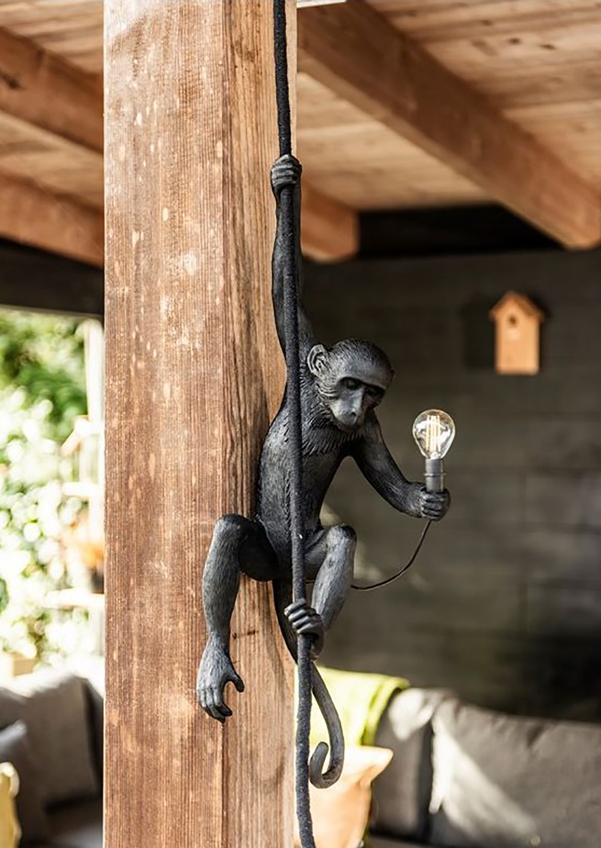 Monkey Lamp Ceiling Black Outdoor Seletti by Marcantonio è la lampada da esterno realizzata in resina ed ispirata ad una simpatica scimmietta tuttofare che sospesa a soffitto attraverso una 'liana' con la zampa sinistra regge una lampadina LED collegata alla presa elettrica ed adatta anche ad utilizzo outdoor oppure indoor.