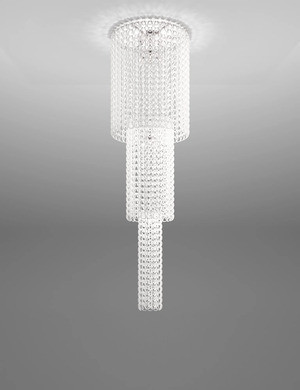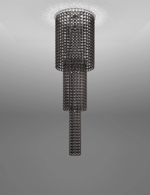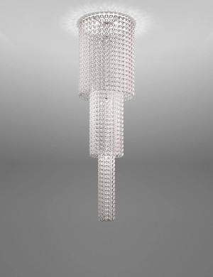Giogali PL Ca1 lampada a sospensione di Vistosi è la lampada a sospensione da un elemento, puro: il gancio di cristallo. È l’intuizione di un Maestro del design italiano come Angelo Mangiarotti che, nel 1967, dà origine al best seller del catalogo Vistosi, Giogali. Un intreccio iconico applicato alla versione che si preferisce.Quella della lavorazione del vetro è un’arte antica, racconta un sapere secolare tramandato di generazione in generazione dall’amore e dalla passione di esperti artigiani, autentici custodi di una tradizione di eccellenza. Quando il saper fare e la lavorazione artigianale incontrano il design, nascono vere e proprie icone dalla bellezza senza tempo, sintesi perfetta di tradizione e innovazione. È il caso delle collezioni Giogali e Minigiogali disegnate nel 1967 da Angelo Mangiarotti per Vistosi, il brand di illuminazione che ha portato il vetro alla perfezione. La lampada Giogali (menzione Compasso d’Oro nel 1969) ha introdotto una nuova concezione nell’uso del vetro: un vero e proprio sistema di illuminazione componibile che si basa su un unico elemento di cristallo lavorato a mano (una sorta di gancio) che può essere replicato idealmente all’infinito per dare vita a strutture che paiono cascate di luce. Il gancio è quindi il modulo base che costituisce l’intera architettura del sistema Giogali (nome che deriva dal veneto “giongher”, ovvero il laccio utilizzato in campagna per legare il carro al giogo), moderna interpretazione di Mangiarotti del lampadario veneziano. Una lunga ricerca, improntata all’innovazione delle forme tradizionali, ha generato il gancio che diventa così l’elemento costruttivo del lampadario in sé. Disponibile in diversi colori, è prevista la versione da tavolo, da soffitto, da parete e a sospensione: l’elemento base può essere agganciato in serie per formare catene di cristallo, a loro volta componibili che originano illimitate soluzioni formali, come lampadari di qualsiasi dimensione che diventano quinte scenografiche tra gli ambienti. Nel 2005, in seguito a un restyling del prodotto, Vistosi ha introdotto la versione Giogali 3D: un nuovo tipo gancio, naturalmente in vetro, consente l’unione agli altri anelli in tutte e quattro le direzioni così da formare una maglia continua che permette grande flessibilità di installazione nello spazio. Oggi Giogali e Minigiogali – la versione ridotta di Giogali, che permette di impiegare i ganci in cristallo per installazioni a parete di minori dimensioni, standard o su misura – hanno silhouette armoniose e arrotondate e composizioni equilibrate: la sorgente luminosa è stata posizionata al centro e in molti modelli il numero di lampadine è stato aumentato. Ciò ha permesso di migliorare notevolmente la diffusione della luce. La catena è stata sostituita da un cavo d’acciaio e da un rosone a lente che ha la medesima finitura della montatura. Tutti questi accorgimenti contribuiscono a donare un sapore nuovo a questa icona del design senza tempo.