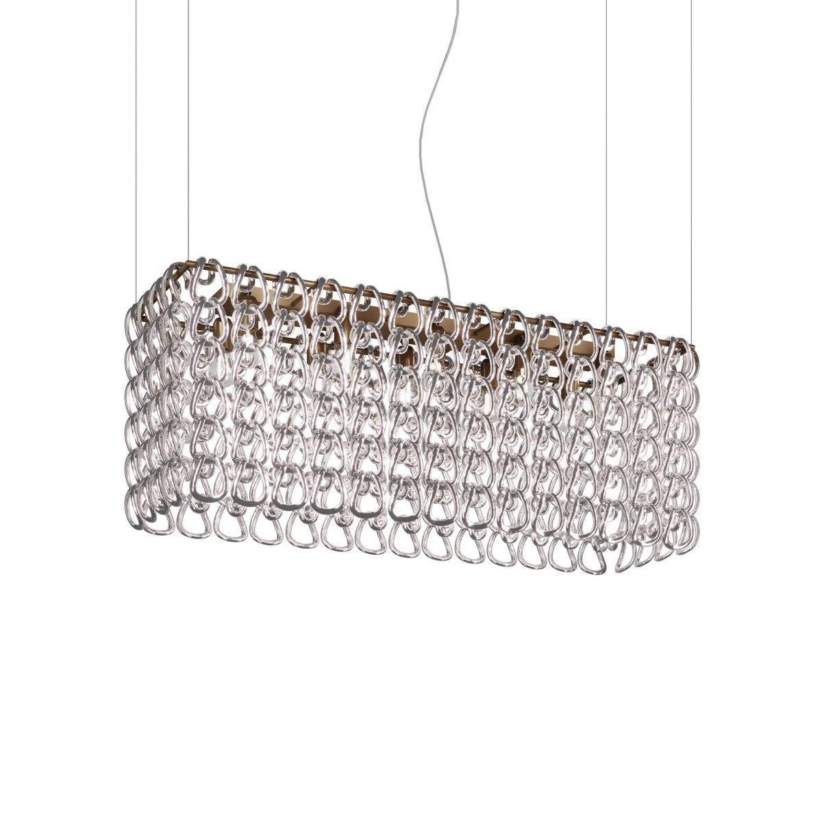 Giogali SP R1b lampada a sospensione di Vistosi è la lampada a sospensione da un elemento, puro: il gancio di cristallo. È l’intuizione di un Maestro del design italiano come Angelo Mangiarotti che, nel 1967, dà origine al best seller del catalogo Vistosi, Giogali. Un intreccio iconico applicato alla versione che si preferisce.Quella della lavorazione del vetro è un’arte antica, racconta un sapere secolare tramandato di generazione in generazione dall’amore e dalla passione di esperti artigiani, autentici custodi di una tradizione di eccellenza. Quando il saper fare e la lavorazione artigianale incontrano il design, nascono vere e proprie icone dalla bellezza senza tempo, sintesi perfetta di tradizione e innovazione. È il caso delle collezioni Giogali e Minigiogali disegnate nel 1967 da Angelo Mangiarotti per Vistosi, il brand di illuminazione che ha portato il vetro alla perfezione. La lampada Giogali (menzione Compasso d’Oro nel 1969) ha introdotto una nuova concezione nell’uso del vetro: un vero e proprio sistema di illuminazione componibile che si basa su un unico elemento di cristallo lavorato a mano (una sorta di gancio) che può essere replicato idealmente all’infinito per dare vita a strutture che paiono cascate di luce. Il gancio è quindi il modulo base che costituisce l’intera architettura del sistema Giogali (nome che deriva dal veneto “giongher”, ovvero il laccio utilizzato in campagna per legare il carro al giogo), moderna interpretazione di Mangiarotti del lampadario veneziano. Una lunga ricerca, improntata all’innovazione delle forme tradizionali, ha generato il gancio che diventa così l’elemento costruttivo del lampadario in sé. Disponibile in diversi colori, è prevista la versione da tavolo, da soffitto, da parete e a sospensione: l’elemento base può essere agganciato in serie per formare catene di cristallo, a loro volta componibili che originano illimitate soluzioni formali, come lampadari di qualsiasi dimensione che diventano quinte scenografiche tra gli ambienti. Nel 2005, in seguito a un restyling del prodotto, Vistosi ha introdotto la versione Giogali 3D: un nuovo tipo gancio, naturalmente in vetro, consente l’unione agli altri anelli in tutte e quattro le direzioni così da formare una maglia continua che permette grande flessibilità di installazione nello spazio. Oggi Giogali e Minigiogali – la versione ridotta di Giogali, che permette di impiegare i ganci in cristallo per installazioni a parete di minori dimensioni, standard o su misura – hanno silhouette armoniose e arrotondate e composizioni equilibrate: la sorgente luminosa è stata posizionata al centro e in molti modelli il numero di lampadine è stato aumentato. Ciò ha permesso di migliorare notevolmente la diffusione della luce. La catena è stata sostituita da un cavo d’acciaio e da un rosone a lente che ha la medesima finitura della montatura. Tutti questi accorgimenti contribuiscono a donare un sapore nuovo a questa icona del design senza tempo.