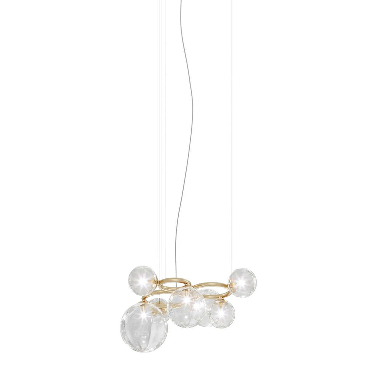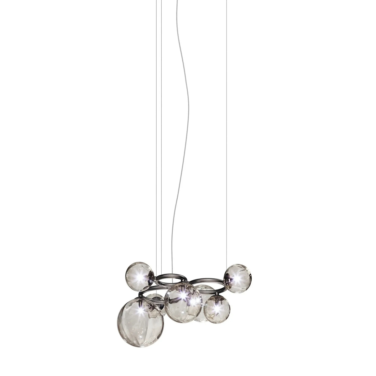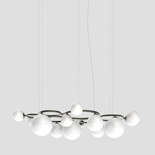 Puppet Ring lampada a sospensione VISTOSI di Vistosi è la lampada a sospensione che nasce dall’idea di creare una montatura accostando anelli con diametro differente, su cui poggiano sfere in cristallo di tre dimensioni. Esteticamente leggera ed elegante, Puppet Ring coniuga in modo etereo vetro cristallo, fumé, ambra e bianco sfumato con finiture oro e nickel nero satinato. La collezione si arricchisce di due nuove sospensioni, che per le dimensioni importanti le rende adatte ad ambienti di grande respiro. Le nuove configurazioni, Puppet Ring SP 7A, Puppet Ring SP 11 e Puppet Ring SP 15, mantengono la grande pulizia formale e l’estrema eleganza preservando la peculiarità di questa collezione, cioè la capacità di unire armoniosamente tradizione artigianale e ricerca tecnica.