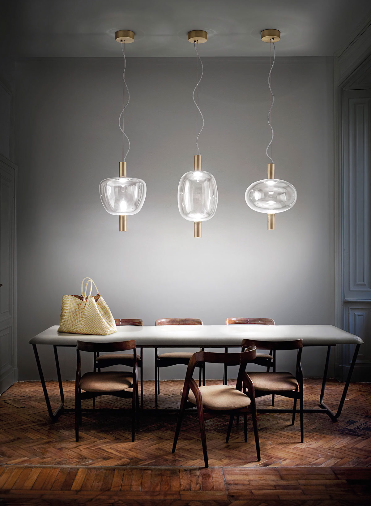 Riflesso SP 3 lampada a sospensione di Vistosi è la lampada a sospensione dove la semplicità e la leggerezza del vetro diventano protagoniste in tre diverse forme sinuose. Le silhouette del diffusore vengono esaltate dalla sorgente luminosa a LED. Le sospensioni presentate assieme o singolarmente caratterizzano l’ambiente con eleganza.