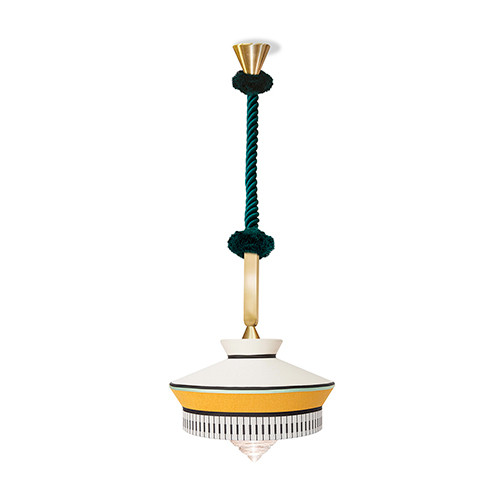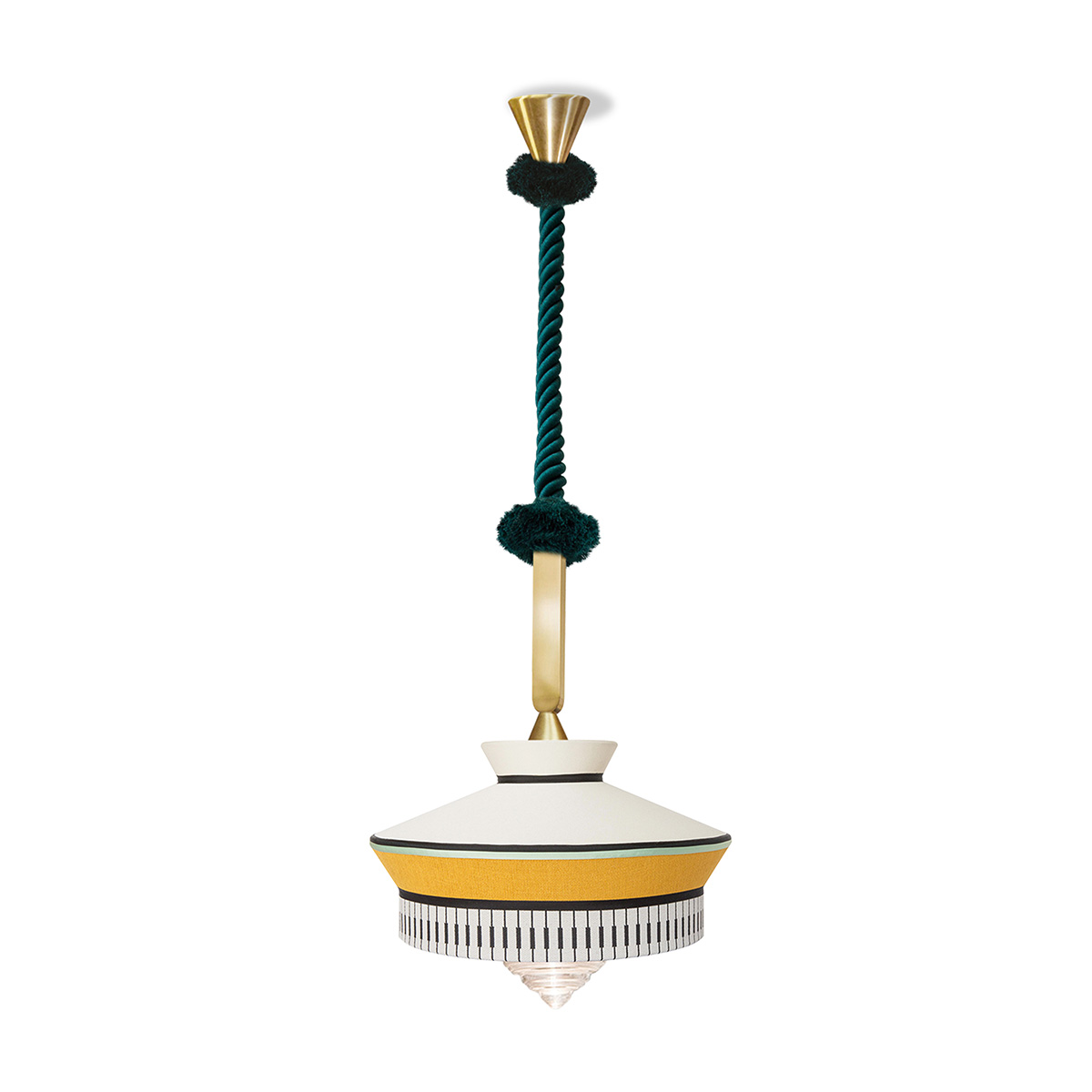 Calypso Martinique Outdoor lampada a sospensione di Contardi è la lampada a sospensione da esterno con grado di protezione IP65, quindi un vero Outdoor. I tessuti impermeabili ed ignifughi di cui è fatto sono adatti a resistere agli agenti atmosferici, alle temperature particolarmente alte o basse che siano, pur mantenendo intatte la qualità dei colori e la sartorialità del prodotto. I cavi elettrici di alimentazione passano all’interno della corda marina in tinta verde e del supporto costituito da un pezzo smussato e di forma conica e circolare con finitura effetto ottone satinato. La sorgente luminosa è posta all’interno di un cilindro di vetro che è sigillato per garantire il grado di protezione IP65. Il diffusore è in vetro trasparente.
