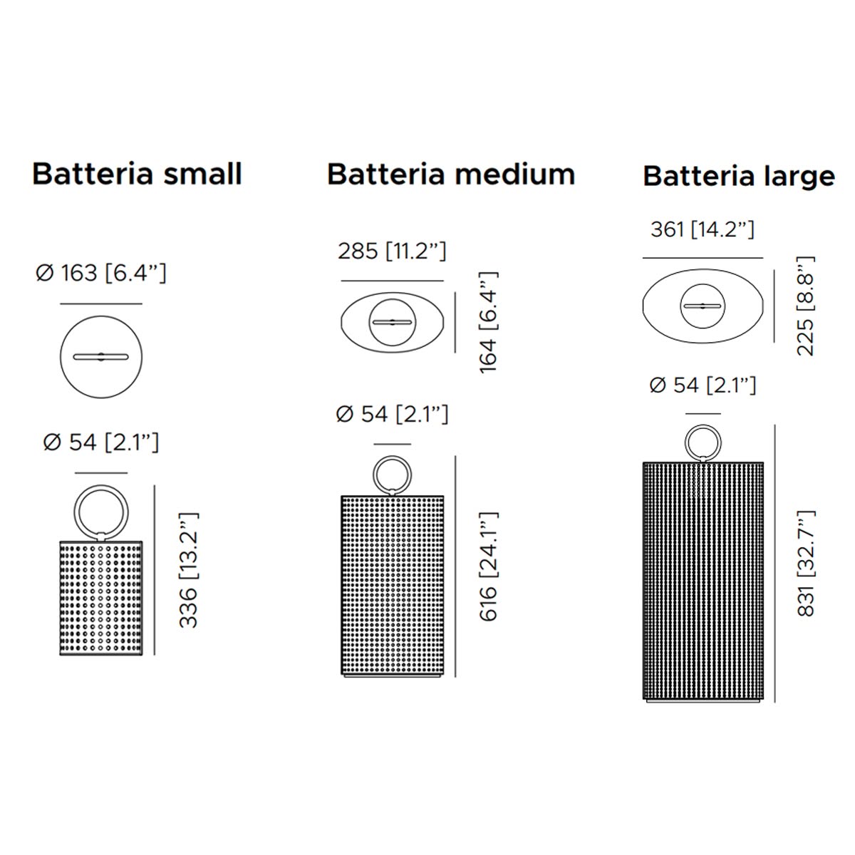 Dimensioni: L: 163/285/361 mm P: 164/225 mm H: 336/616/831 mm Peso: 2/4/6 kg