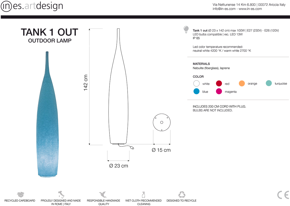 Tank 1 Out lampada da esterno di In-es.artdesign è la lampada da esterno appartenente alla collezione Out che attraverso un design che racchiude sfumature e sensazioni variegate, crea l’atmosfera ideale per aperitivi, cene o per godersi il relax sotto al sole o al cielo stellato. Vi permetterà dopo il tramonto di illuminare il giardino o la terrazza con una varietà di forme e di colori, adattabili ad ogni tipo di spazio.