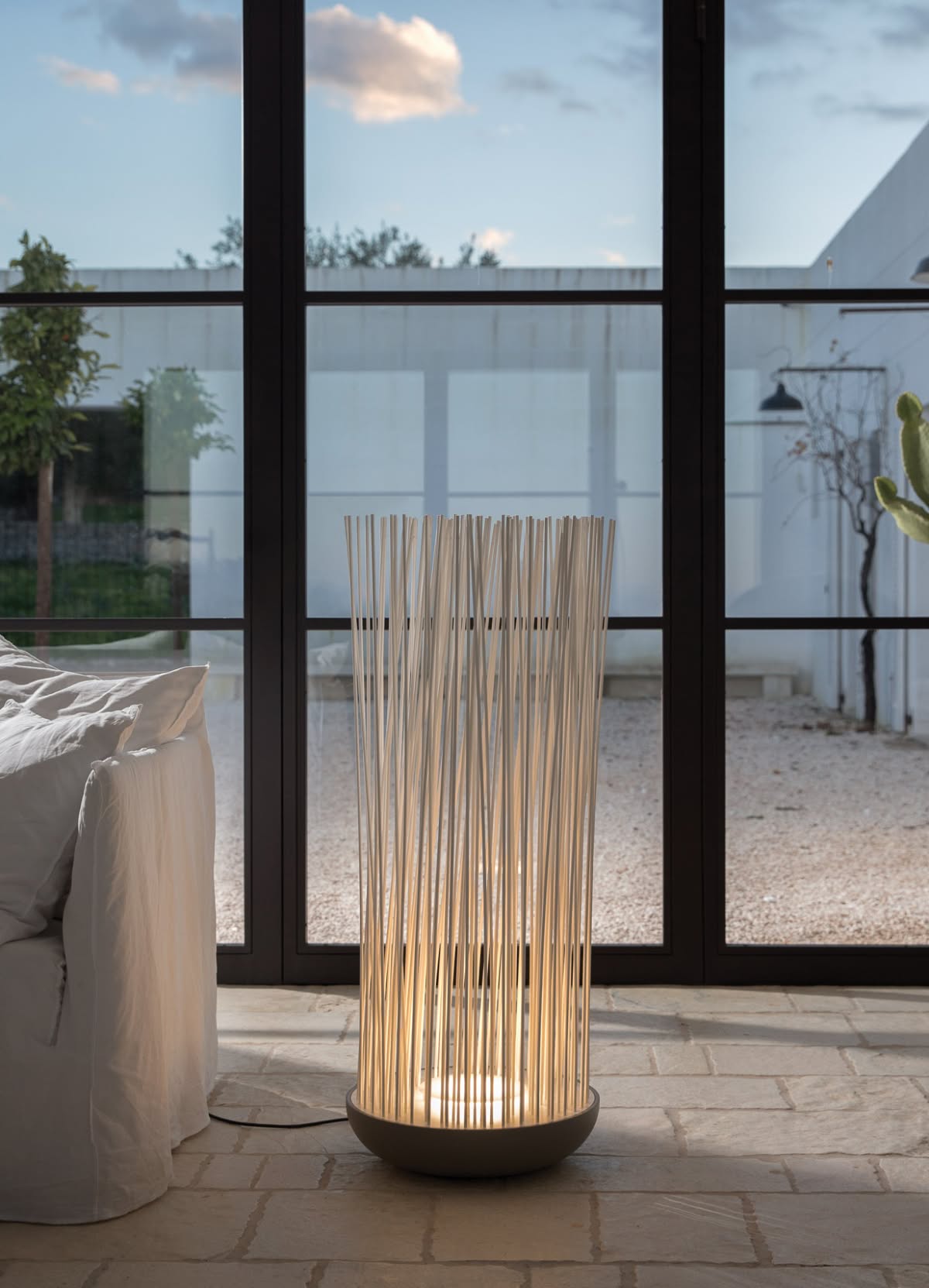 Don't Touch lampada da terra Outdoor di Karman è la lampada da esterno in tecnopolimero grigio opaco e bacchette in PVC bianco opaco che ti coinvolge nel progetto dei cinque sensi, attraverso il tatto per dare all'oggetto non solo la funzione di illuminare, ma anche il potere di trasmettere a chi lo guarda una voglia irresistibile di sfiorarlo. Attenzione! Non illuderti perché anche tu non potrai fare a meno di toccarlo!