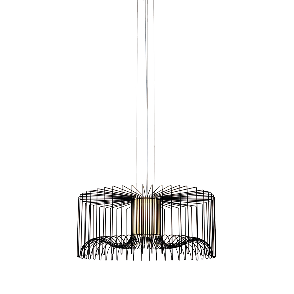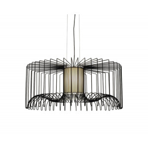 Sospensione con struttura in filo d’acciaio verniciato nei colori bianco, nero o bronze opaco.
