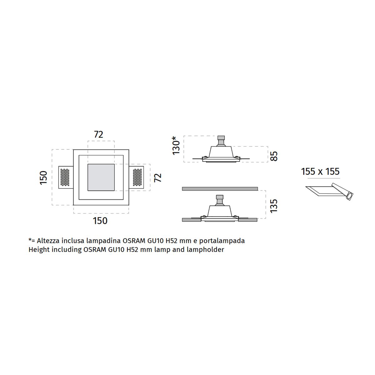 Foro sul cartongesso: 155 mm x 155 mm