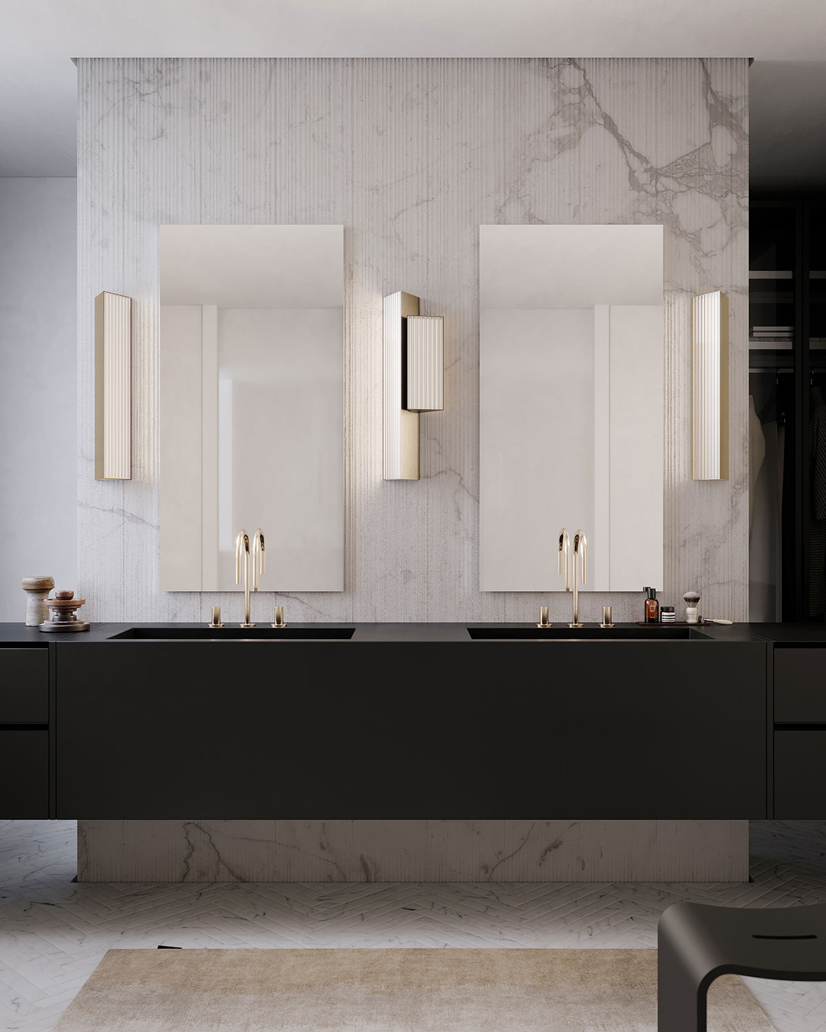 Stick ap lampada da parete di Contardi è la lampada da parete dalla preziosa semplicità. Elementi triangolari dalle linee pure ed essenziali, che emanano una luce suggestiva pur essendo funzionali. La luce diventa protagonista, grazie al diffusore rigato, scelto ad hoc per produrre giochi di luce unici in vari contesti. Prodotto esteticamente minimalista, Stick è tecnicamente realizzato secondo uno standard molto elevato, senza viti o fissaggi, tranne sul retro. Elementi puri e architettonici si fondono all’interno di un corpo illuminante di grande carattere. Stick illumina l’ambiente circostante in modo uniforme se visto di fronte; tuttavia, a seconda dell’angolo di visione, crea effetti di luce differenti. La gamma di prodotti Stick è costituita da lampade a parete, a sospensione e da terra.